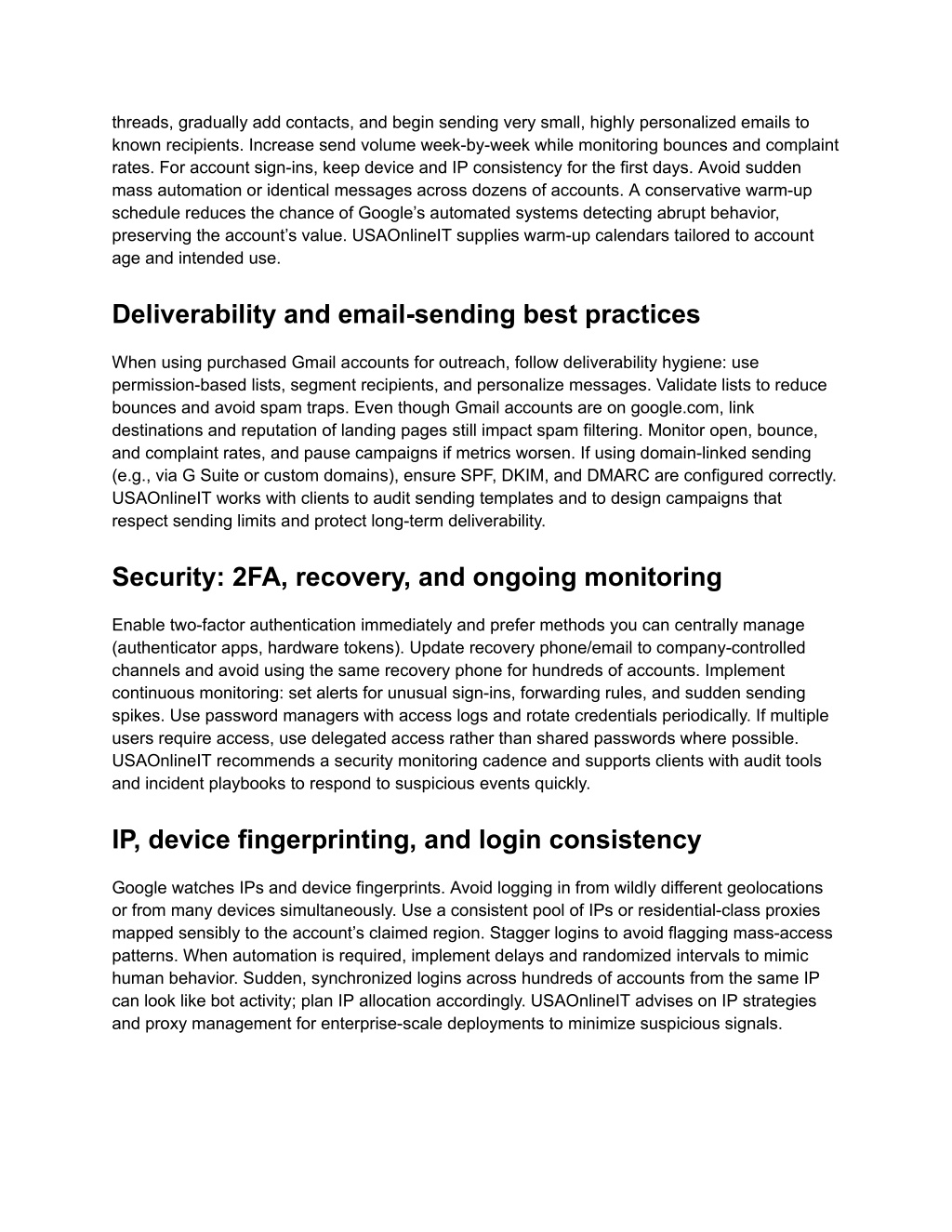 4. threads, gradually add contacts, and begin sending very small, highly personalized emails to known recipients. Increase send volume week-by-week while monitoring bounces and complaint rates. For account sign-ins, keep device and IP consistency for the first days. Avoid sudden mass automation or identical messages across dozens of accounts. A conservative warm-up schedule reduces the chance of Google’s automated systems detecting abrupt behavior, preserving the account’s value. USAOnlineIT supplies warm-up calendars tailored to account age and intended use. Deliverability and email-sending best practices When using purchased Gmail accounts for outreach, follow deliverability hygiene: use permission-based lists, segment recipients, and personalize messages. Validate lists to reduce bounces and avoid spam traps. Even though Gmail accounts are on google.com, link destinations and reputation of landing pages still impact spam filtering. Monitor open, bounce, and complaint rates, and pause campaigns if metrics worsen. If using domain-linked sending (e.g., via G Suite or custom domains), ensure SPF, DKIM, and DMARC are configured correctly. USAOnlineIT works with clients to audit sending templates and to design campaigns that respect sending limits and protect long-term deliverability. Security: 2FA, recovery, and ongoing monitoring Enable two-factor authentication immediately and prefer methods you can centrally manage (authenticator apps, hardware tokens). Update recovery phone/email to company-controlled channels and avoid using the same recovery phone for hundreds of accounts. Implement continuous monitoring: set alerts for unusual sign-ins, forwarding rules, and sudden sending spikes. Use password managers with access logs and rotate credentials periodically. If multiple users require access, use delegated access rather than shared passwords where possible. USAOnlineIT recommends a security monitoring cadence and supports clients with audit tools and incident playbooks to respond to suspicious events quickly. IP, device fingerprinting, and login consistency Google watches IPs and device fingerprints. Avoid logging in from wildly different geolocations or from many devices simultaneously. Use a consistent pool of IPs or residential-class proxies mapped sensibly to the account’s claimed region. Stagger logins to avoid flagging mass-access patterns. When automation is required, implement delays and randomized intervals to mimic human behavior. Sudden, synchronized logins across hundreds of accounts from the same IP can look like bot activity; plan IP allocation accordingly. USAOnlineIT advises on IP strategies and proxy management for enterprise-scale deployments to minimize suspicious signals.
