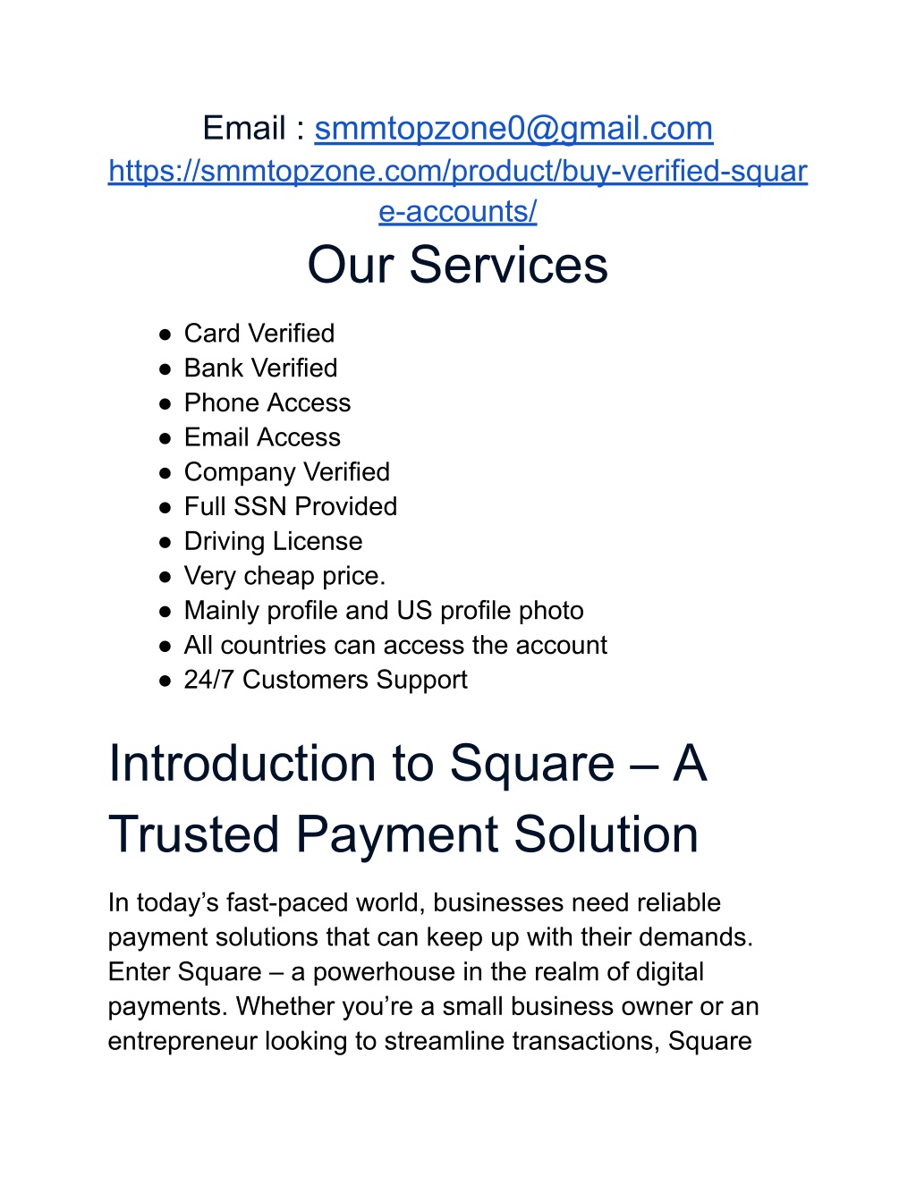 2. Email : smmtopzone0@gmail.com https://smmtopzone.com/product/buy-verified-squar e-accounts/ Our Services ● Card Verified ● Bank Verified ● Phone Access ● Email Access ● Company Verified ● Full SSN Provided ● Driving License ● Very cheap price. ● Mainly profile and US profile photo ● All countries can access the account ● 24/7 Customers Support Introduction to Square – A Trusted Payment Solution In today’s fast-paced world, businesses need reliable payment solutions that can keep up with their demands. Enter Square – a powerhouse in the realm of digital payments. Whether you’re a small business owner or an entrepreneur looking to streamline transactions, Square