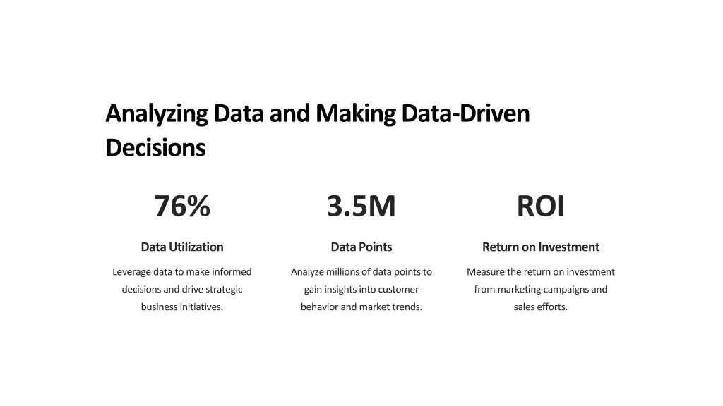 Analyzing Data and Making Data-Driven Decisions 76% 3.5M ROI Data Utilization Data Points Return on Investment Leverage data to make informed decisions and drive strategic business initiatives. Analyze millions of data points to gain insights into customer behavior and market trends. Measure the return on investment from marketing campaigns and sales efforts.