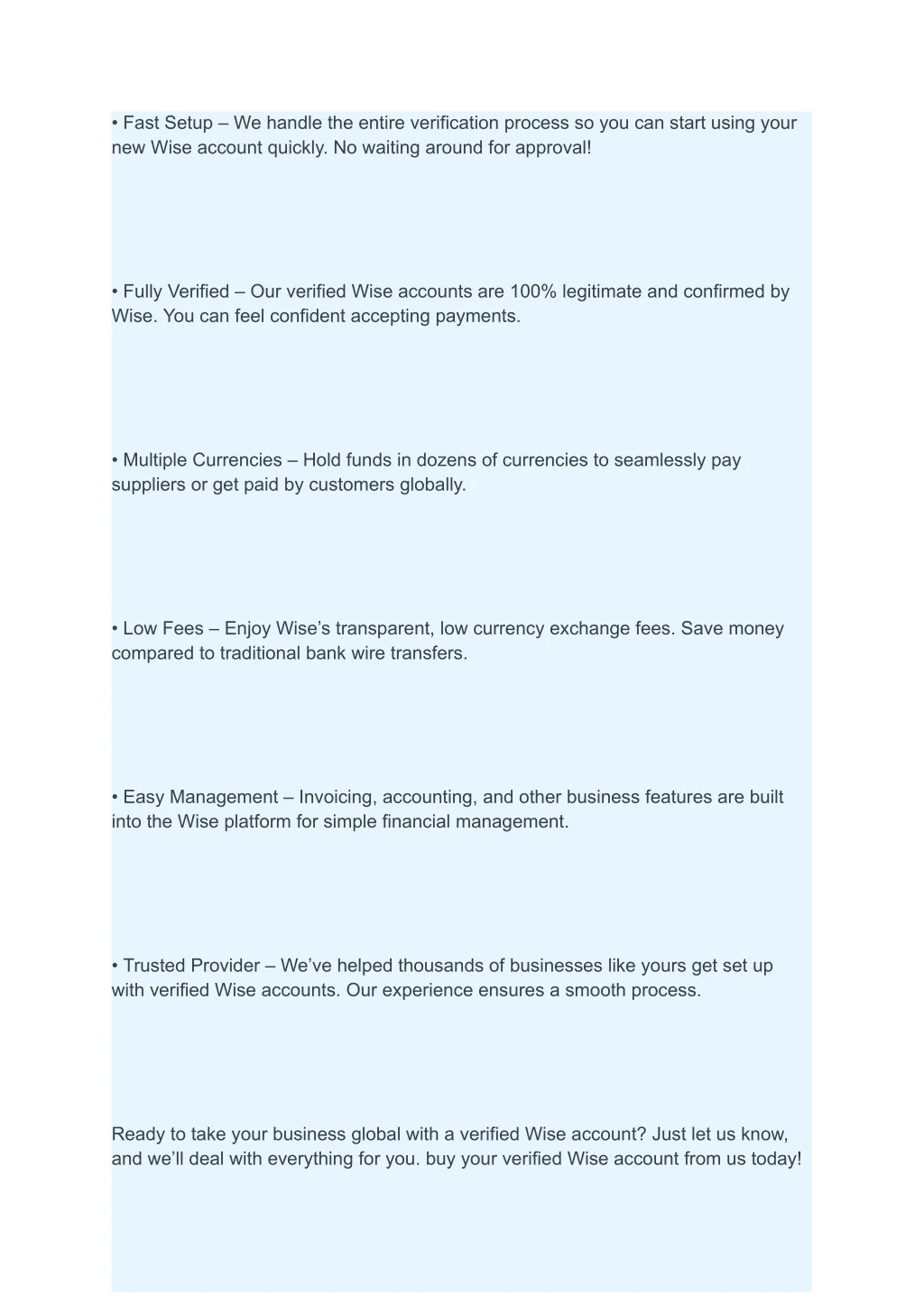 • Fast Setup – We handle the entire verification process so you can start using your new Wise account quickly. No waiting around for approval! • Fully Verified – Our verified Wise accounts are 100% legitimate and confirmed by Wise. You can feel confident accepting payments. • Multiple Currencies – Hold funds in dozens of currencies to seamlessly pay suppliers or get paid by customers globally. • Low Fees – Enjoy Wise’s transparent, low currency exchange fees. Save money compared to traditional bank wire transfers. • Easy Management – Invoicing, accounting, and other business features are built into the Wise platform for simple financial management. • Trusted Provider – We’ve helped thousands of businesses like yours get set up with verified Wise accounts. Our experience ensures a smooth process. Ready to take your business global with a verified Wise account? Just let us know, and we’ll deal with everything for you. buy your verified Wise account from us today!
