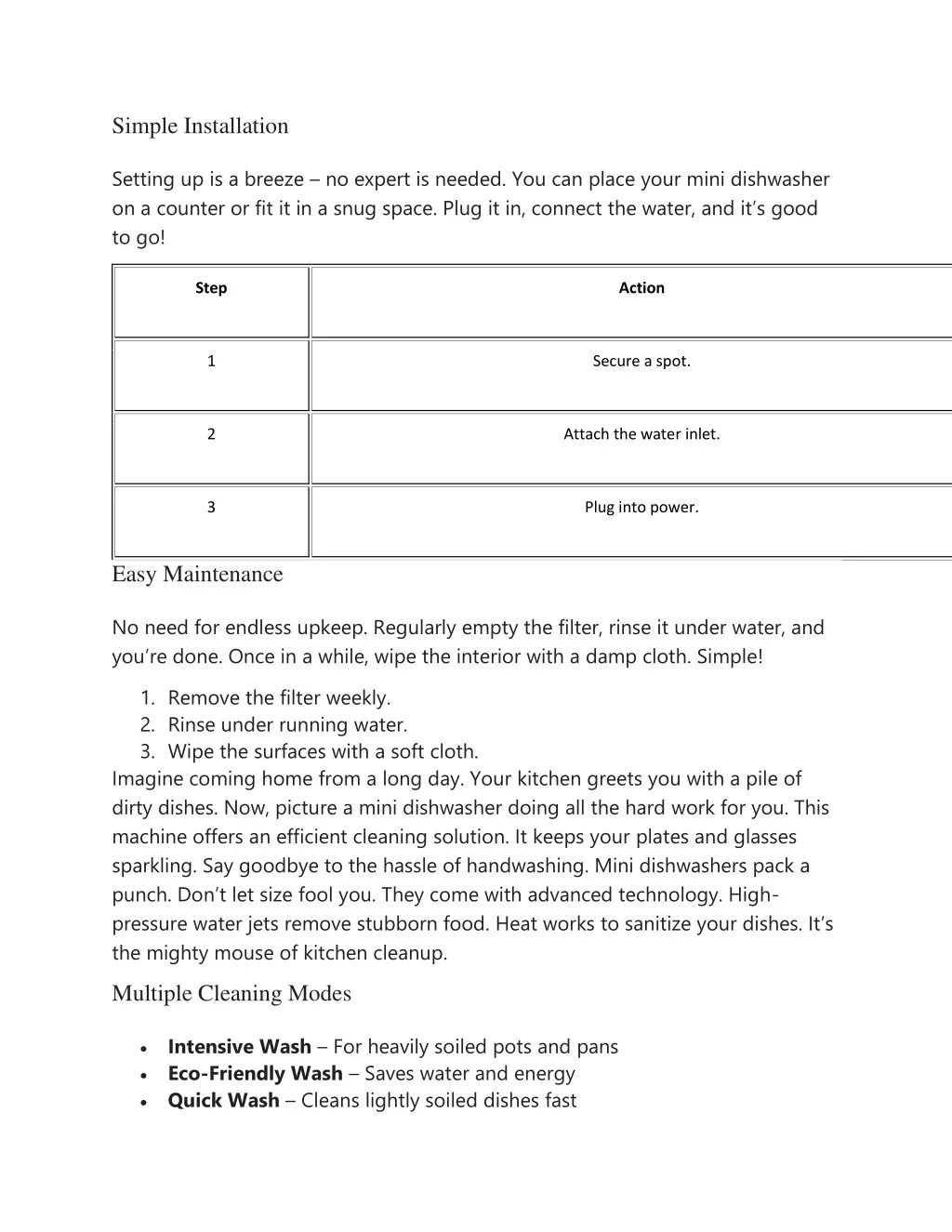 Simple Installation Setting up is a breeze – no expert is needed. You can place your mini dishwasher on a counter or fit it in a snug space. Plug it in, connect the water, and it’s good to go! Step Action 1 Secure a spot. 2 Attach the water inlet. 3 Plug into power. Easy Maintenance No need for endless upkeep. Regularly empty the filter, rinse it under water, and you’re done. Once in a while, wipe the interior with a damp cloth. Simple! 1.Remove the filter weekly. 2.Rinse under running water. 3.Wipe the surfaces with a soft cloth. Imagine coming home from a long day. Your kitchen greets you with a pile of dirty dishes. Now, picture a mini dishwasher doing all the hard work for you. This machine offers an efficient cleaning solution. It keeps your plates and glasses sparkling. Say goodbye to the hassle of handwashing. Mini dishwashers pack a punch. Don’t let size fool you. They come with advanced technology. High- pressure water jets remove stubborn food. Heat works to sanitize your dishes. It’s the mighty mouse of kitchen cleanup. Multiple Cleaning Modes Intensive Wash– For heavily soiled pots and pans Eco-Friendly Wash– Saves water and energy Quick Wash– Cleans lightly soiled dishes fast