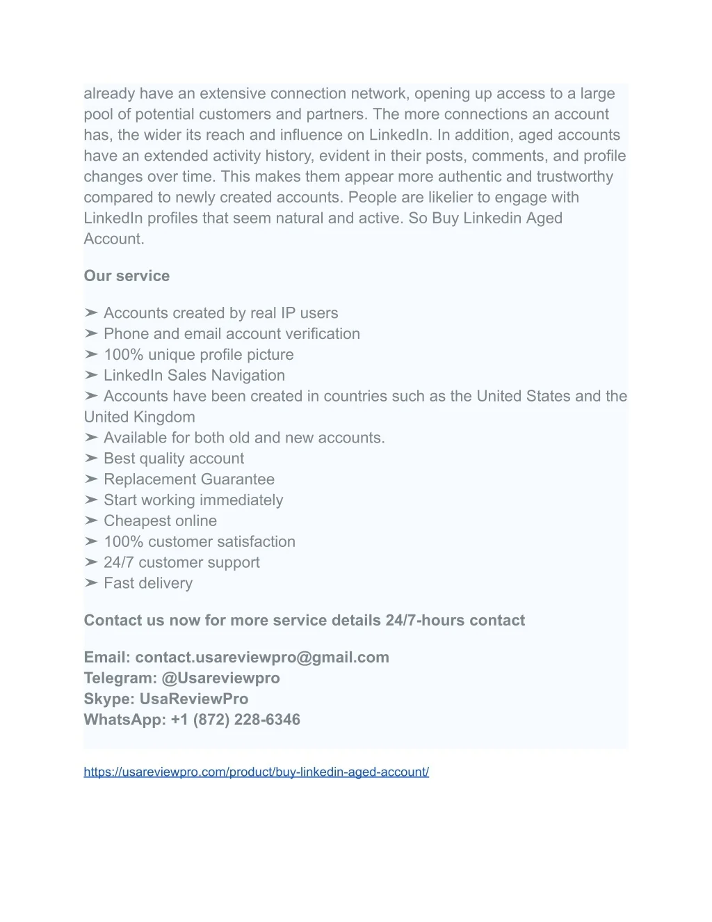 already have an extensive connection network, opening up access to a large pool of potential customers and partners. The more connections an account has, the wider its reach and influence on LinkedIn. In addition, aged accounts have an extended activity history, evident in their posts, comments, and profile changes over time. This makes them appear more authentic and trustworthy compared to newly created accounts. People are likelier to engage with LinkedIn profiles that seem natural and active. So Buy Linkedin Aged Account. Our service ➤ Accounts created by real IP users ➤ Phone and email account verification ➤ 100% unique profile picture ➤ LinkedIn Sales Navigation ➤ Accounts have been created in countries such as the United States and the United Kingdom ➤ Available for both old and new accounts. ➤ Best quality account ➤ Replacement Guarantee ➤ Start working immediately ➤ Cheapest online ➤ 100% customer satisfaction ➤ 24/7 customer support ➤ Fast delivery Contact us now for more service details 24/7-hours contact Email: contact.usareviewpro@gmail.com Telegram: @Usareviewpro Skype: UsaReviewPro WhatsApp: +1 (872) 228-6346 https://usareviewpro.com/product/buy-linkedin-aged-account/