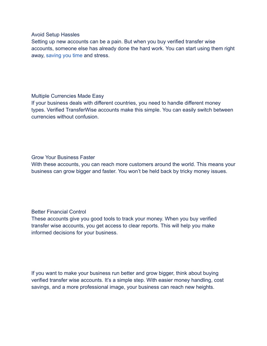 Avoid Setup Hassles Setting up new accounts can be a pain. But when you buy verified transfer wise accounts, someone else has already done the hard work. You can start using them right away, saving you time and stress. Multiple Currencies Made Easy If your business deals with different countries, you need to handle different money types. Verified TransferWise accounts make this simple. You can easily switch between currencies without confusion. Grow Your Business Faster With these accounts, you can reach more customers around the world. This means your business can grow bigger and faster. You won’t be held back by tricky money issues. Better Financial Control These accounts give you good tools to track your money. When you buy verified transfer wise accounts, you get access to clear reports. This will help you make informed decisions for your business. If you want to make your business run better and grow bigger, think about buying verified transfer wise accounts. It’s a simple step. With easier money handling, cost savings, and a more professional image, your business can reach new heights.