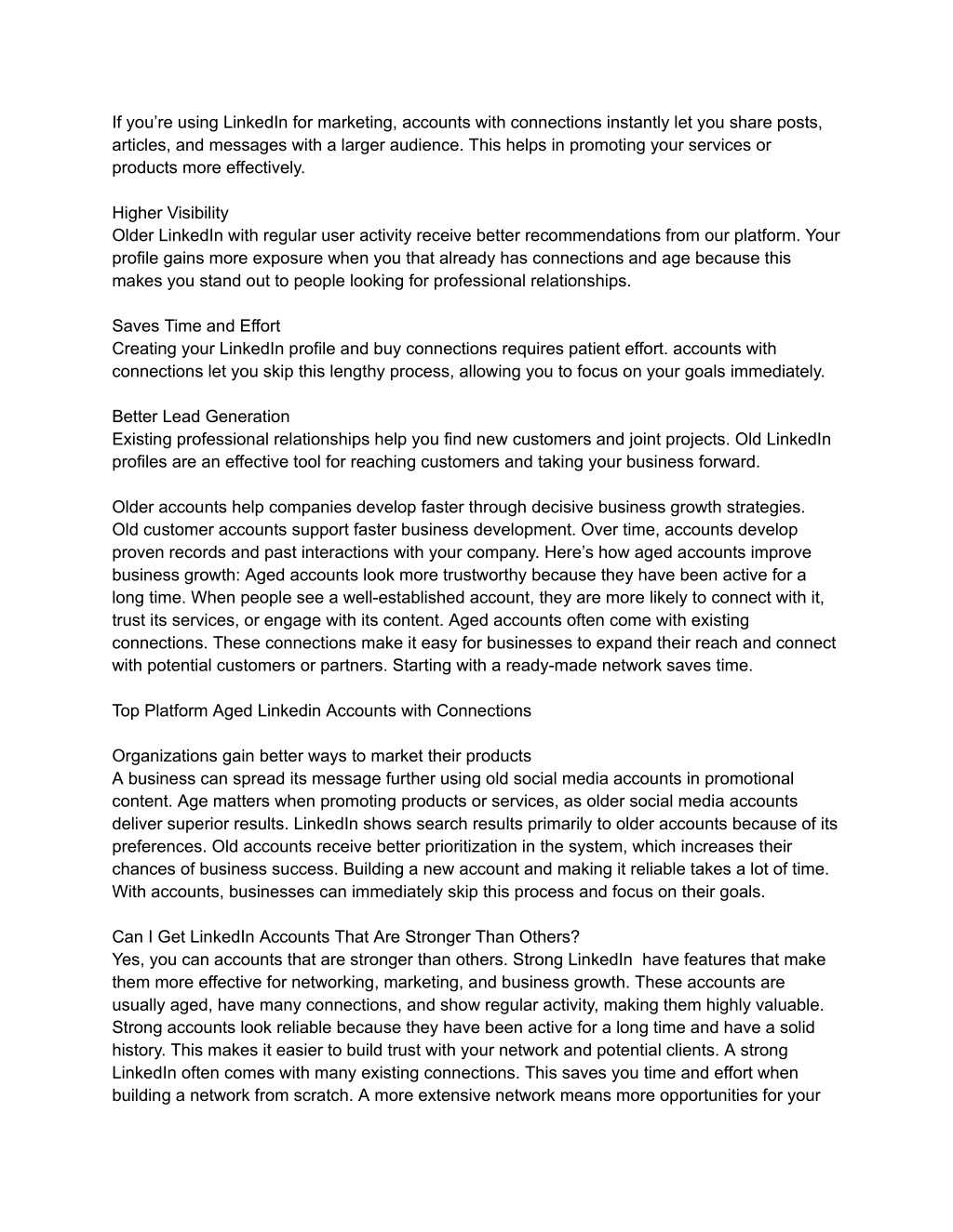 If you’re using LinkedIn for marketing, accounts with connections instantly let you share posts, articles, and messages with a larger audience. This helps in promoting your services or products more effectively. Higher Visibility Older LinkedIn with regular user activity receive better recommendations from our platform. Your profile gains more exposure when you that already has connections and age because this makes you stand out to people looking for professional relationships. Saves Time and Effort Creating your LinkedIn profile and buy connections requires patient effort. accounts with connections let you skip this lengthy process, allowing you to focus on your goals immediately. Better Lead Generation Existing professional relationships help you find new customers and joint projects. Old LinkedIn profiles are an effective tool for reaching customers and taking your business forward. Older accounts help companies develop faster through decisive business growth strategies. Old customer accounts support faster business development. Over time, accounts develop proven records and past interactions with your company. Here’s how aged accounts improve business growth: Aged accounts look more trustworthy because they have been active for a long time. When people see a well-established account, they are more likely to connect with it, trust its services, or engage with its content. Aged accounts often come with existing connections. These connections make it easy for businesses to expand their reach and connect with potential customers or partners. Starting with a ready-made network saves time. Top Platform Aged Linkedin Accounts with Connections Organizations gain better ways to market their products A business can spread its message further using old social media accounts in promotional content. Age matters when promoting products or services, as older social media accounts deliver superior results. LinkedIn shows search results primarily to older accounts because of its preferences. Old accounts receive better prioritization in the system, which increases their chances of business success. Building a new account and making it reliable takes a lot of time. With accounts, businesses can immediately skip this process and focus on their goals. Can I Get LinkedIn Accounts That Are Stronger Than Others? Yes, you can accounts that are stronger than others. Strong LinkedIn have features that make them more effective for networking, marketing, and business growth. These accounts are usually aged, have many connections, and show regular activity, making them highly valuable. Strong accounts look reliable because they have been active for a long time and have a solid history. This makes it easier to build trust with your network and potential clients. A strong LinkedIn often comes with many existing connections. This saves you time and effort when building a network from scratch. A more extensive network means more opportunities for your
