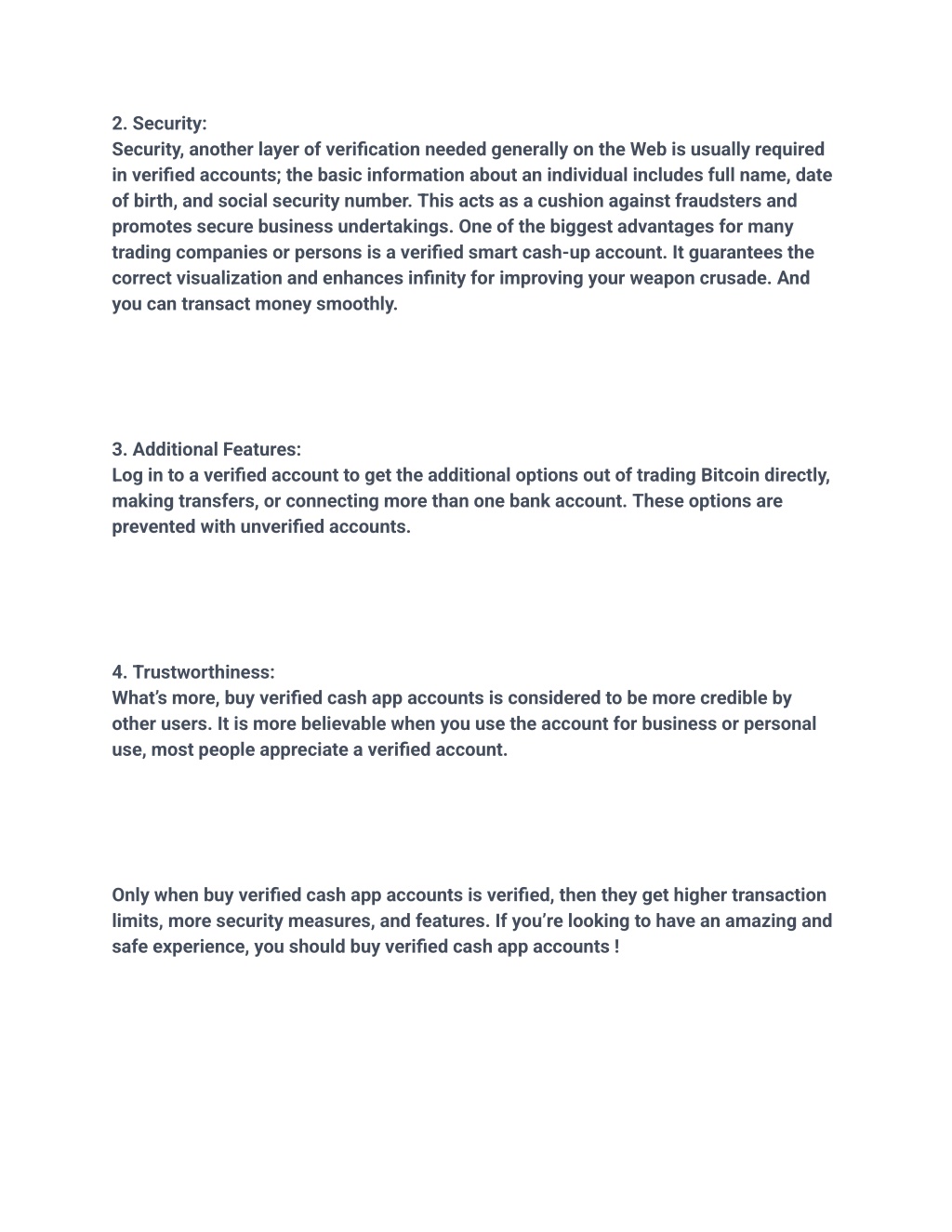 2. Security: Security, another layer of verification needed generally on the Web is usually required in verified accounts; the basic information about an individual includes full name, date of birth, and social security number. This acts as a cushion against fraudsters and promotes secure business undertakings. One of the biggest advantages for many trading companies or persons is a verified smart cash-up account. It guarantees the correct visualization and enhances infinity for improving your weapon crusade. And you can transact money smoothly. 3. Additional Features: Log in to a verified account to get the additional options out of trading Bitcoin directly, making transfers, or connecting more than one bank account. These options are prevented with unverified accounts. 4. Trustworthiness: What’s more, buy verified cash app accounts is considered to be more credible by other users. It is more believable when you use the account for business or personal use, most people appreciate a verified account. Only when buy verified cash app accounts is verified, then they get higher transaction limits, more security measures, and features. If you’re looking to have an amazing and safe experience, you should buy verified cash app accounts !