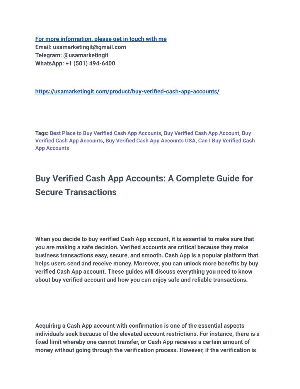 For more information, please get in touch with me Email: usamarketingit@gmail.com Telegram: @usamarketingit WhatsApp: +1 (501) 494-6400 https://usamarketingit.com/product/buy-verified-cash-app-accounts/ Tags: Best Place to Buy Verified Cash App Accounts, Buy Verified Cash App Account, Buy Verified Cash App Accounts, Buy Verified Cash App Accounts USA, Can I Buy Verified Cash App Accounts Buy Verified Cash App Accounts: A Complete Guide for Secure Transactions When you decide to buy verified Cash App account, it is essential to make sure that you are making a safe decision. Verified accounts are critical because they make business transactions easy, secure, and smooth. Cash App is a popular platform that helps users send and receive money. Moreover, you can unlock more benefits by buy verified Cash App account. These guides will discuss everything you need to know about buy verified account and how you can enjoy safe and reliable transactions. Acquiring a Cash App account with confirmation is one of the essential aspects individuals seek because of the elevated account restrictions. For instance, there is a fixed limit whereby one cannot transfer, or Cash App receives a certain amount of money without going through the verification process. However, if the verification is