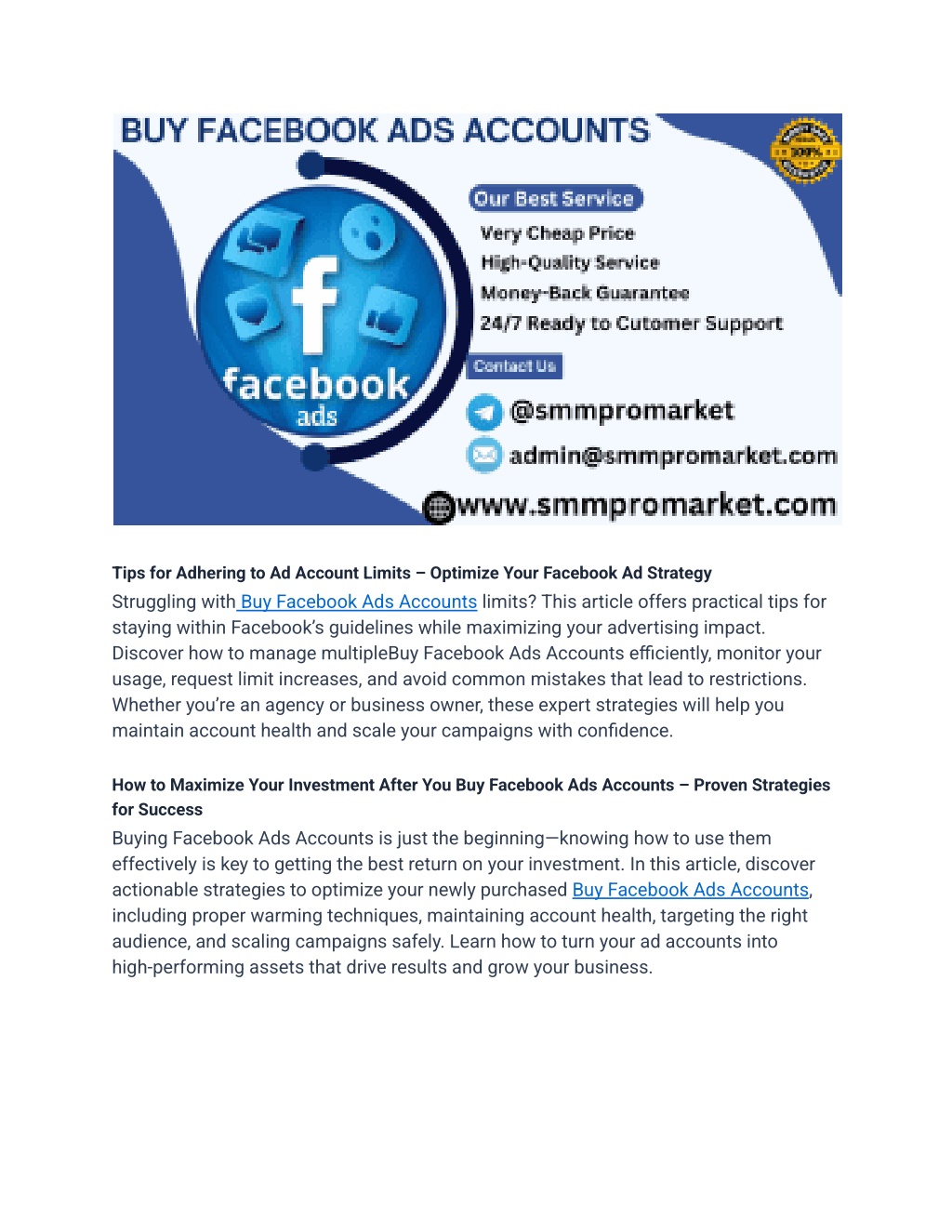 Tips for Adhering to Ad Account Limits – Optimize Your Facebook Ad Strategy Struggling with Buy Facebook Ads Accounts limits? This article offers practical tips for staying within Facebook’s guidelines while maximizing your advertising impact. Discover how to manage multipleBuy Facebook Ads Accounts efficiently, monitor your usage, request limit increases, and avoid common mistakes that lead to restrictions. Whether you’re an agency or business owner, these expert strategies will help you maintain account health and scale your campaigns with confidence. How to Maximize Your Investment After You Buy Facebook Ads Accounts – Proven Strategies for Success Buying Facebook Ads Accounts is just the beginning—knowing how to use them effectively is key to getting the best return on your investment. In this article, discover actionable strategies to optimize your newly purchased Buy Facebook Ads Accounts, including proper warming techniques, maintaining account health, targeting the right audience, and scaling campaigns safely. Learn how to turn your ad accounts into high-performing assets that drive results and grow your business.
