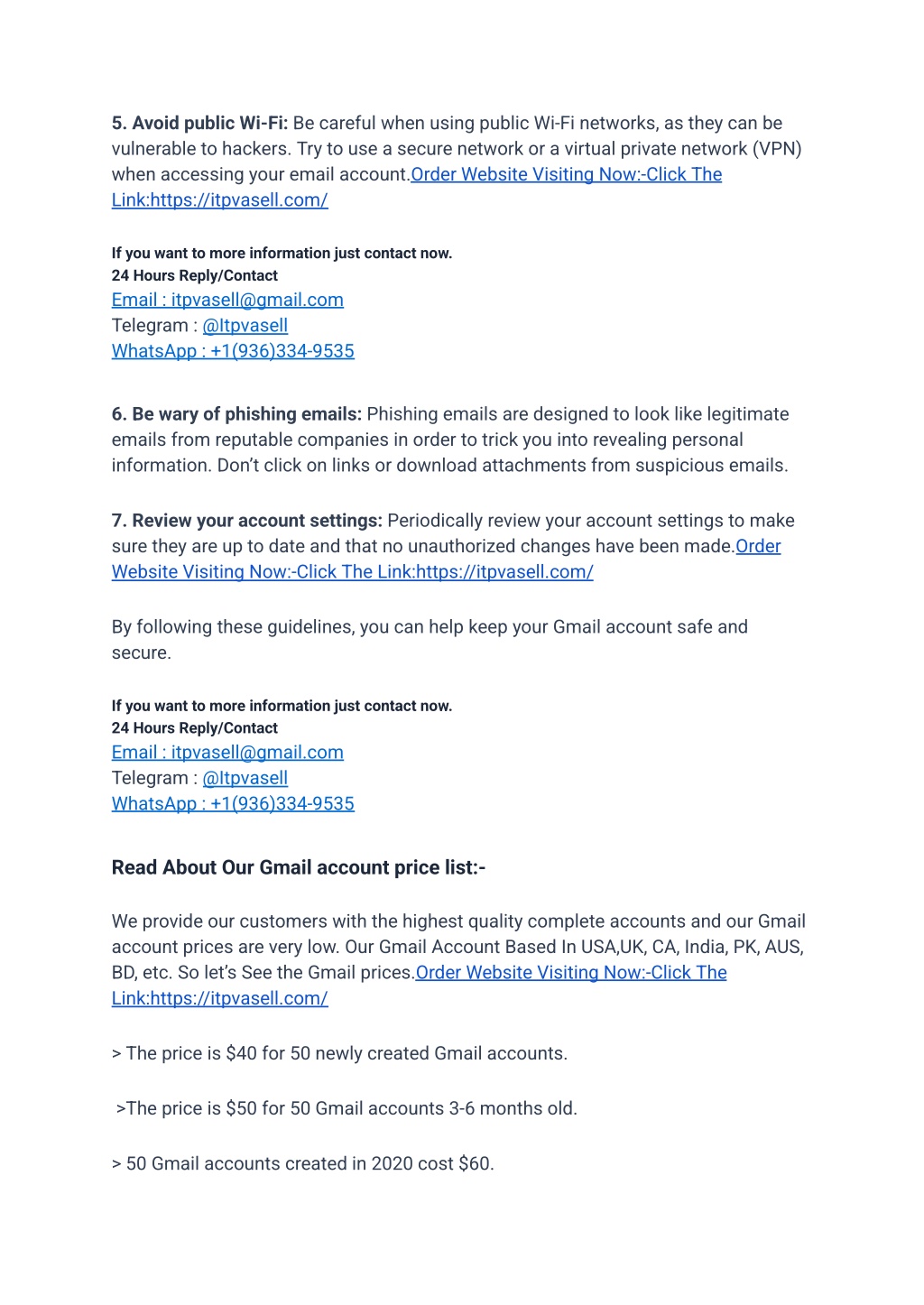 5. Avoid public Wi-Fi: Be careful when using public Wi-Fi networks, as they can be vulnerable to hackers. Try to use a secure network or a virtual private network (VPN) when accessing your email account.Order Website Visiting Now:-Click The Link:https://itpvasell.com/ If you want to more information just contact now. 24 Hours Reply/Contact Email : itpvasell@gmail.com Telegram : @Itpvasell WhatsApp : +1(936)334-9535 6. Be wary of phishing emails: Phishing emails are designed to look like legitimate emails from reputable companies in order to trick you into revealing personal information. Don’t click on links or download attachments from suspicious emails. 7. Review your account settings: Periodically review your account settings to make sure they are up to date and that no unauthorized changes have been made.Order Website Visiting Now:-Click The Link:https://itpvasell.com/ By following these guidelines, you can help keep your Gmail account safe and secure. If you want to more information just contact now. 24 Hours Reply/Contact Email : itpvasell@gmail.com Telegram : @Itpvasell WhatsApp : +1(936)334-9535 Read About Our Gmail account price list:- We provide our customers with the highest quality complete accounts and our Gmail account prices are very low. Our Gmail Account Based In USA,UK, CA, India, PK, AUS, BD, etc. So let’s See the Gmail prices.Order Website Visiting Now:-Click The Link:https://itpvasell.com/ > The price is $40 for 50 newly created Gmail accounts. >The price is $50 for 50 Gmail accounts 3-6 months old. > 50 Gmail accounts created in 2020 cost $60.