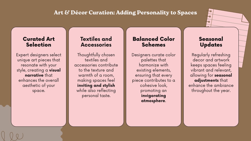 Art & Décor Curation: Adding Personality to Spaces Curated Art Selection Textiles and Accessories Balanced Color Schemes Seasonal Updates Expert designers select unique art pieces that resonate with your style, creating a visual narrative that enhances the overall aesthetic of your space. Thoughtfully chosen textiles and accessories contribute to the texture and warmth of a room, making spaces feel inviting and stylish while also reflecting personal taste. Designers curate color palettes that harmonize with existing elements, ensuring that every piece contributes to a cohesive look, promoting an invigorating atmosphere. Regularly refreshing decor and artwork keeps spaces feeling vibrant and relevant, allowing for seasonal adjustments that enhance the ambiance throughout the year.