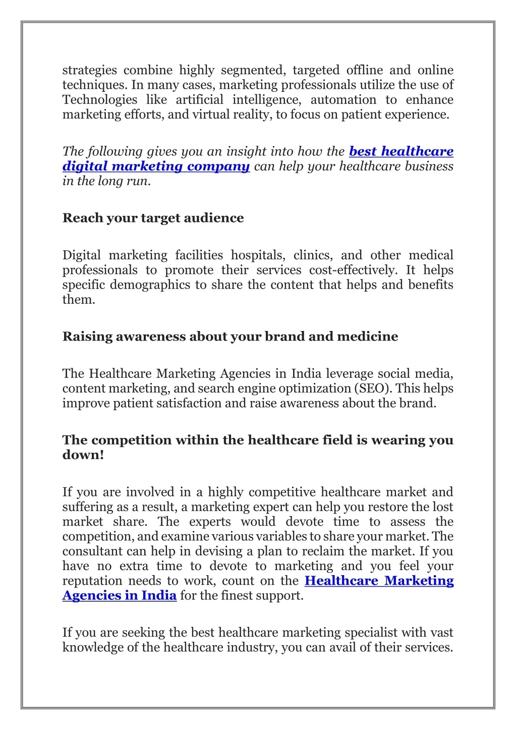 strategies combine highly segmented, targeted offline and online techniques. In many cases, marketing professionals utilize the use of Technologies like artificial intelligence, automation to enhance marketing efforts, and virtual reality, to focus on patient experience. The following gives you an insight into how the best healthcare digital marketing company can help your healthcare business in the long run. Reach your target audience Digital marketing facilities hospitals, clinics, and other medical professionals to promote their services cost-effectively. It helps specific demographics to share the content that helps and benefits them. Raising awareness about your brand and medicine The Healthcare Marketing Agencies in India leverage social media, content marketing, and search engine optimization (SEO). This helps improve patient satisfaction and raise awareness about the brand. The competition within the healthcare field is wearing you down! If you are involved in a highly competitive healthcare market and suffering as a result, a marketing expert can help you restore the lost market share. The experts would devote time to assess the competition, and examine various variables to share your market. The consultant can help in devising a plan to reclaim the market. If you have no extra time to devote to marketing and you feel your reputation needs to work, count on the Healthcare Marketing Agencies in India for the finest support. If you are seeking the best healthcare marketing specialist with vast knowledge of the healthcare industry, you can avail of their services.
