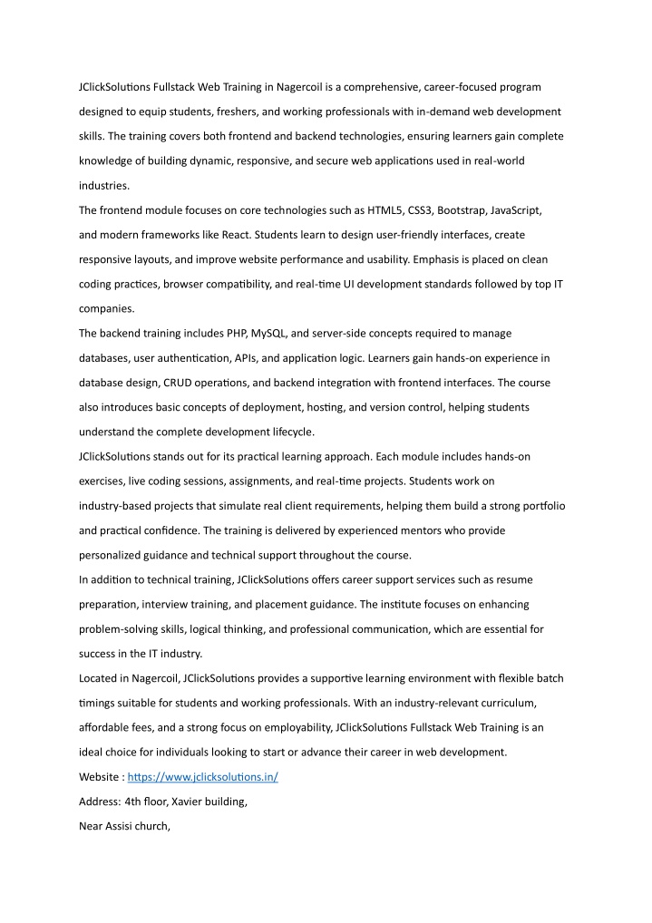 JClickSolutions Fullstack Web Training in Nagercoil is a comprehensive, career-focused program designed to equip students, freshers, and working professionals with in-demand web development skills. The training covers both frontend and backend technologies, ensuring learners gain complete knowledge of building dynamic, responsive, and secure web applications used in real-world industries. The frontend module focuses on core technologies such as HTML5, CSS3, Bootstrap, JavaScript, and modern frameworks like React. Students learn to design user-friendly interfaces, create responsive layouts, and improve website performance and usability. Emphasis is placed on clean coding practices, browser compatibility, and real-time UI development standards followed by top IT companies. The backend training includes PHP, MySQL, and server-side concepts required to manage databases, user authentication, APIs, and application logic. Learners gain hands-on experience in database design, CRUD operations, and backend integration with frontend interfaces. The course also introduces basic concepts of deployment, hosting, and version control, helping students understand the complete development lifecycle. JClickSolutions stands out for its practical learning approach. Each module includes hands-on exercises, live coding sessions, assignments, and real-time projects. Students work on industry-based projects that simulate real client requirements, helping them build a strong portfolio and practical confidence. The training is delivered by experienced mentors who provide personalized guidance and technical support throughout the course. In addition to technical training, JClickSolutions offers career support services such as resume preparation, interview training, and placement guidance. The institute focuses on enhancing problem-solving skills, logical thinking, and professional communication, which are essential for success in the IT industry. Located in Nagercoil, JClickSolutions provides a supportive learning environment with flexible batch timings suitable for students and working professionals. With an industry-relevant curriculum, affordable fees, and a strong focus on employability, JClickSolutions Fullstack Web Training is an ideal choice for individuals looking to start or advance their career in web development. Website : https://www.jclicksolutions.in/ Address:4th floor, Xavier building, Near Assisi church,