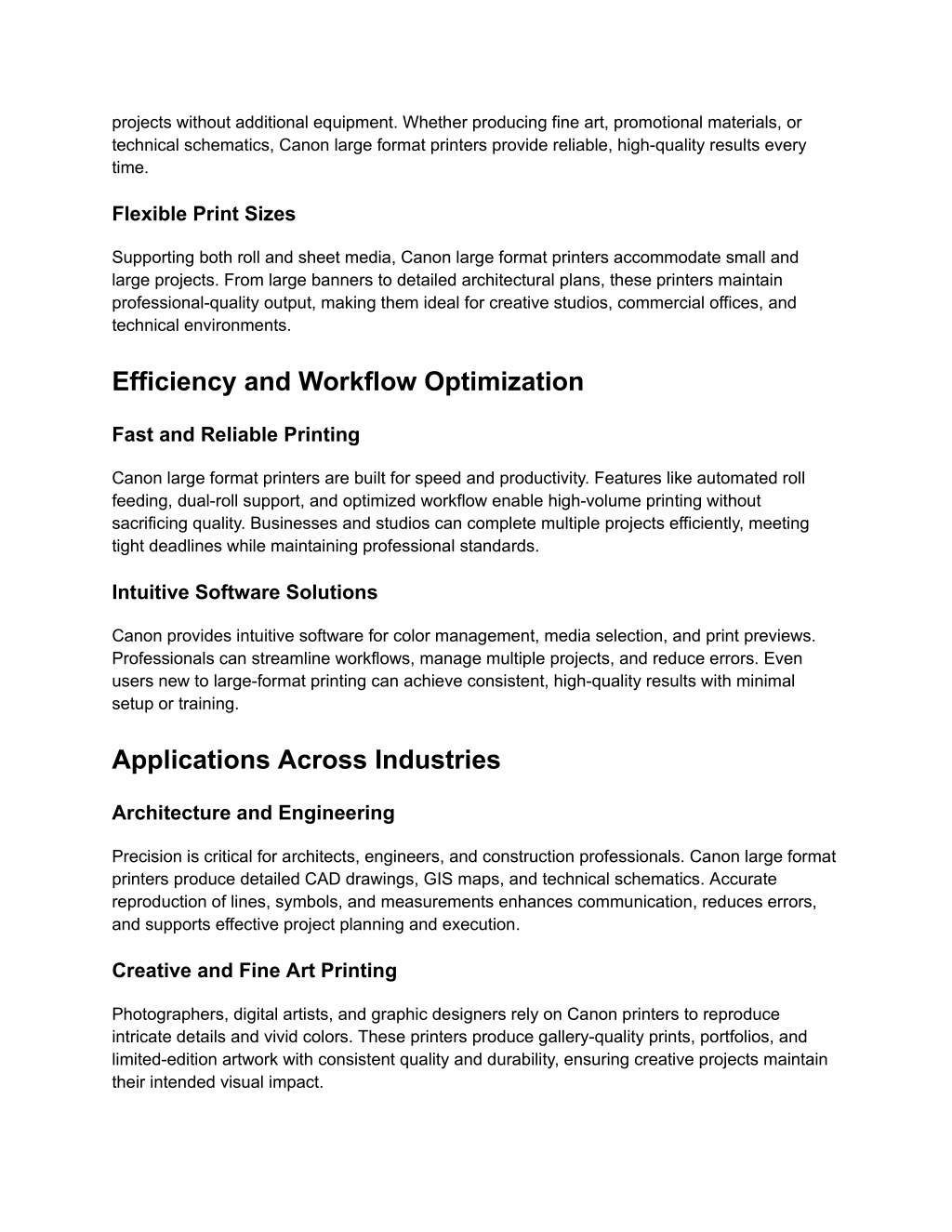 projects without additional equipment. Whether producing fine art, promotional materials, or technical schematics, Canon large format printers provide reliable, high-quality results every time. Flexible Print Sizes Supporting both roll and sheet media, Canon large format printers accommodate small and large projects. From large banners to detailed architectural plans, these printers maintain professional-quality output, making them ideal for creative studios, commercial offices, and technical environments. Efficiency and Workflow Optimization Fast and Reliable Printing Canon large format printers are built for speed and productivity. Features like automated roll feeding, dual-roll support, and optimized workflow enable high-volume printing without sacrificing quality. Businesses and studios can complete multiple projects efficiently, meeting tight deadlines while maintaining professional standards. Intuitive Software Solutions Canon provides intuitive software for color management, media selection, and print previews. Professionals can streamline workflows, manage multiple projects, and reduce errors. Even users new to large-format printing can achieve consistent, high-quality results with minimal setup or training. Applications Across Industries Architecture and Engineering Precision is critical for architects, engineers, and construction professionals. Canon large format printers produce detailed CAD drawings, GIS maps, and technical schematics. Accurate reproduction of lines, symbols, and measurements enhances communication, reduces errors, and supports effective project planning and execution. Creative and Fine Art Printing Photographers, digital artists, and graphic designers rely on Canon printers to reproduce intricate details and vivid colors. These printers produce gallery-quality prints, portfolios, and limited-edition artwork with consistent quality and durability, ensuring creative projects maintain their intended visual impact.
