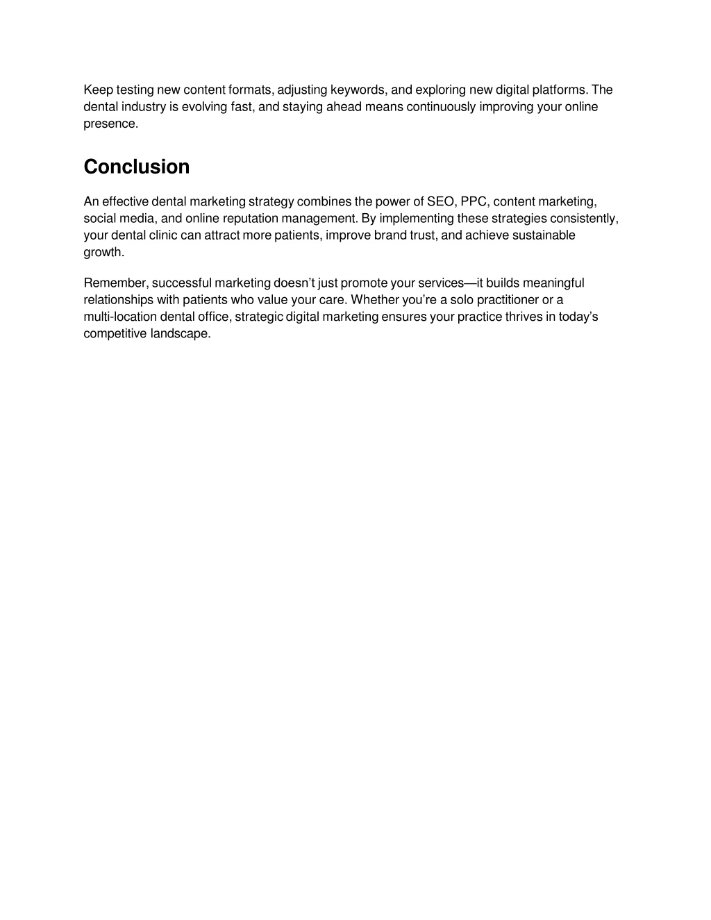6. Keeptestingnewcontentformats,adjustingkeywords,andexploringnewdigitalplatforms.The dentalindustryisevolvingfast,andstayingaheadmeanscontinuouslyimprovingyouronline presence. Conclusion AneffectivedentalmarketingstrategycombinesthepowerofSEO,PPC,contentmarketing, socialmedia,andonlinereputationmanagement.Byimplementingthesestrategiesconsistently, yourdentalcliniccanattractmorepatients,improvebrandtrust,andachievesustainablegrowth. Remember,successfulmarketingdoesn’tjustpromoteyourservices—itbuildsmeaningful relationshipswithpatientswhovalueyourcare.Whetheryou’reasolopractitionerora multi-locationdentaloffice,strategicdigitalmarketingensuresyourpracticethrivesintoday’s competitivelandscape.