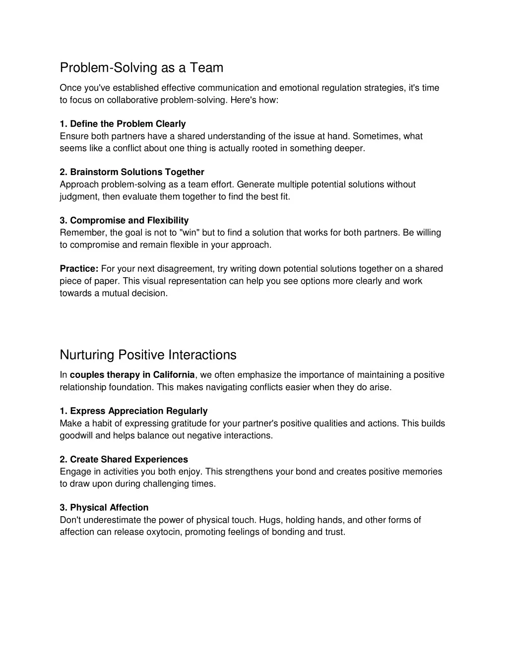 Problem-Solving as a Team Once you've established effective communication and emotional regulation strategies, it's time to focus on collaborative problem-solving. Here's how: 1. Define the Problem Clearly Ensure both partners have a shared understanding of the issue at hand. Sometimes, what seems like a conflict about one thing is actually rooted in something deeper. 2. Brainstorm Solutions Together Approach problem-solving as a team effort. Generate multiple potential solutions without judgment, then evaluate them together to find the best fit. 3. Compromise and Flexibility Remember, the goal is not to "win" but to find a solution that works for both partners. Be willing to compromise and remain flexible in your approach. Practice: For your next disagreement, try writing down potential solutions together on a shared piece of paper. This visual representation can help you see options more clearly and work towards a mutual decision. Nurturing Positive Interactions In couples therapy in California, we often emphasize the importance of maintaining a positive relationship foundation. This makes navigating conflicts easier when they do arise. 1. Express Appreciation Regularly Make a habit of expressing gratitude for your partner's positive qualities and actions. This builds goodwill and helps balance out negative interactions. 2. Create Shared Experiences Engage in activities you both enjoy. This strengthens your bond and creates positive memories to draw upon during challenging times. 3. Physical Affection Don't underestimate the power of physical touch. Hugs, holding hands, and other forms of affection can release oxytocin, promoting feelings of bonding and trust.