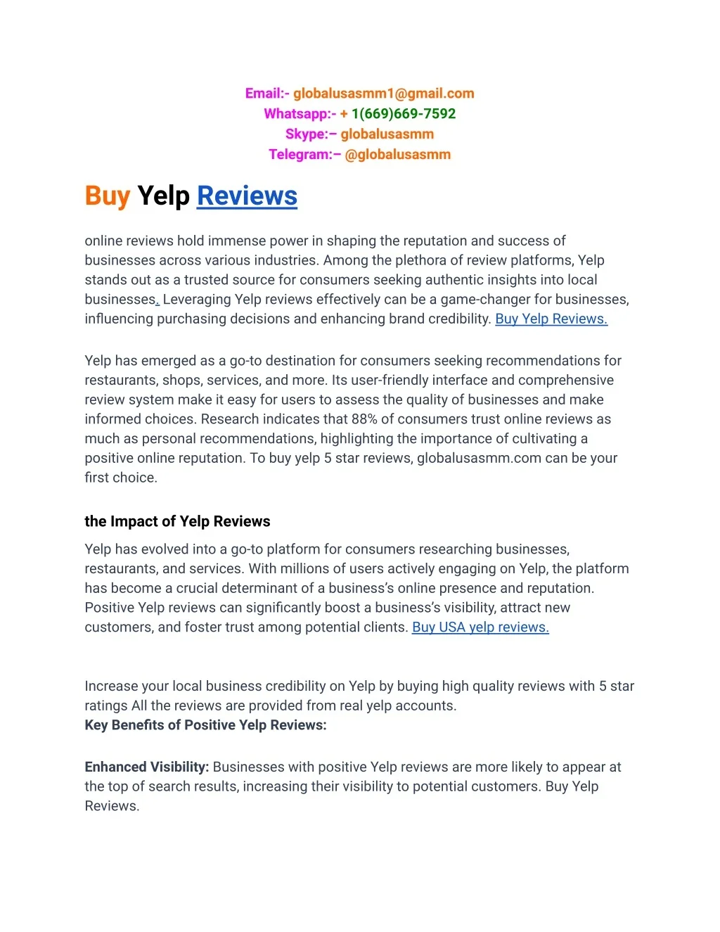 Email:- globalusasmm1@gmail.com Whatsapp:- + 1(669)669-7592 Skype:– globalusasmm Telegram:– @globalusasmm Buy Yelp Reviews online reviews hold immense power in shaping the reputation and success of businesses across various industries. Among the plethora of review platforms, Yelp stands out as a trusted source for consumers seeking authentic insights into local businesses. Leveraging Yelp reviews effectively can be a game-changer for businesses, influencing purchasing decisions and enhancing brand credibility. Buy Yelp Reviews. Yelp has emerged as a go-to destination for consumers seeking recommendations for restaurants, shops, services, and more. Its user-friendly interface and comprehensive review system make it easy for users to assess the quality of businesses and make informed choices. Research indicates that 88% of consumers trust online reviews as much as personal recommendations, highlighting the importance of cultivating a positive online reputation. To buy yelp 5 star reviews, globalusasmm.com can be your first choice. the Impact of Yelp Reviews Yelp has evolved into a go-to platform for consumers researching businesses, restaurants, and services. With millions of users actively engaging on Yelp, the platform has become a crucial determinant of a business’s online presence and reputation. Positive Yelp reviews can significantly boost a business’s visibility, attract new customers, and foster trust among potential clients. Buy USA yelp reviews. Increase your local business credibility on Yelp by buying high quality reviews with 5 star ratings All the reviews are provided from real yelp accounts. Key Benefits of Positive Yelp Reviews: Enhanced Visibility: Businesses with positive Yelp reviews are more likely to appear at the top of search results, increasing their visibility to potential customers. Buy Yelp Reviews.