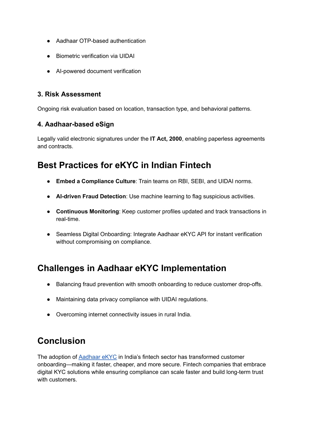 ● Aadhaar OTP-based authentication ● Biometric verification via UIDAI ● AI-powered document verification 3. Risk Assessment Ongoing risk evaluation based on location, transaction type, and behavioral patterns. 4. Aadhaar-based eSign Legally valid electronic signatures under the IT Act, 2000, enabling paperless agreements and contracts. Best Practices for eKYC in Indian Fintech ● Embed a Compliance Culture: Train teams on RBI, SEBI, and UIDAI norms. ● AI-driven Fraud Detection: Use machine learning to flag suspicious activities. ● Continuous Monitoring: Keep customer profiles updated and track transactions in real-time. ● Seamless Digital Onboarding: Integrate Aadhaar eKYC API for instant verification without compromising on compliance. Challenges in Aadhaar eKYC Implementation ● Balancing fraud prevention with smooth onboarding to reduce customer drop-offs. ● Maintaining data privacy compliance with UIDAI regulations. ● Overcoming internet connectivity issues in rural India. Conclusion The adoption of Aadhaar eKYC in India’s fintech sector has transformed customer onboarding—making it faster, cheaper, and more secure. Fintech companies that embrace digital KYC solutions while ensuring compliance can scale faster and build long-term trust with customers.