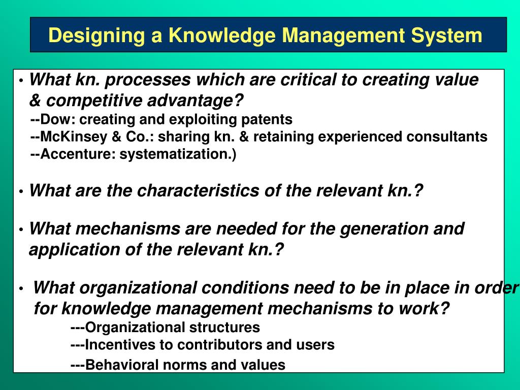 Designing a Knowledge Management System • What kn. processes which are critical to creating value • & competitive advantage? • --Dow: creating and exploiting patents • --McKinsey & Co.: sharing kn. & retaining experienced consultants • --Accenture: systematization.) • What are the characteristics of the relevant kn.? • What mechanisms are needed for the generation and • application of the relevant kn.? • What organizational conditions need to be in place in order • for knowledge management mechanisms to work? • ---Organizational structures • ---Incentives to contributors and users • ---Behavioral norms and values