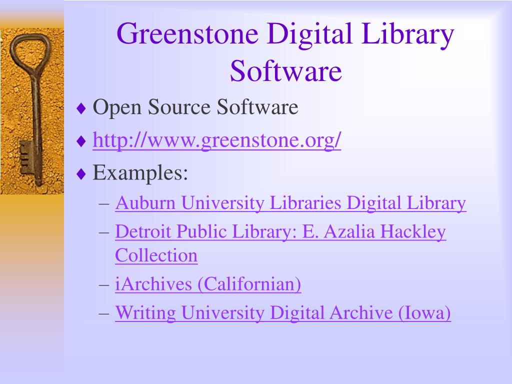 Greenstone Digital Library Software • Open Source Software • http://www.greenstone.org/ • Examples: • Auburn University Libraries Digital Library • Detroit Public Library: E. Azalia Hackley Collection • iArchives (Californian) • Writing University Digital Archive (Iowa)