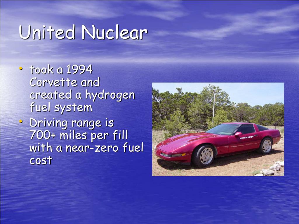 United Nuclear • took a 1994 Corvette and created a hydrogen fuel system • Driving range is 700+ miles per fill with a near-zero fuel cost