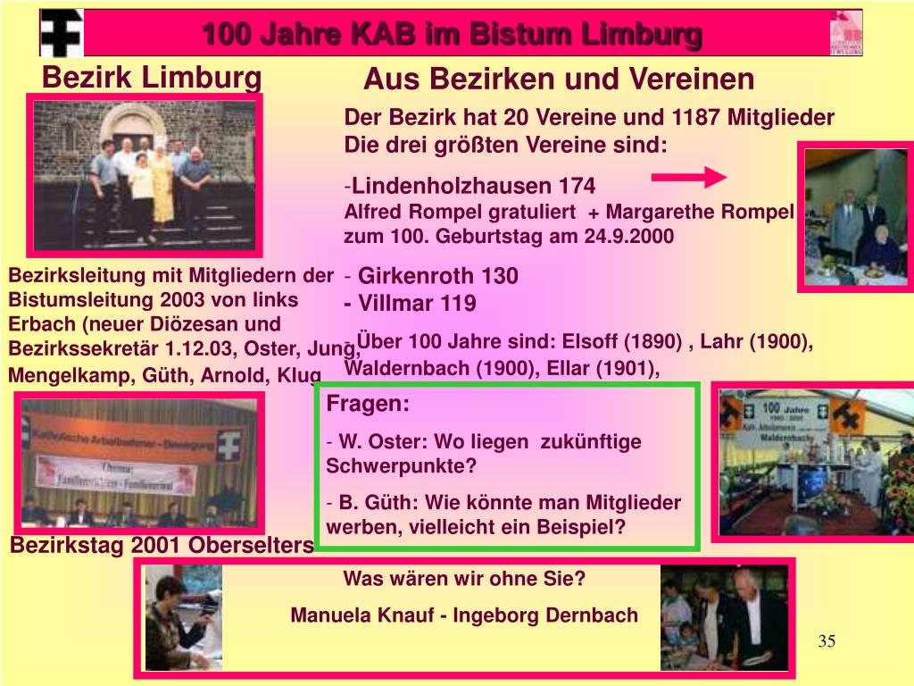 100 Jahre KAB im Bistum Limburg Wichtige Ereignisse der letzten Jahre Am 24.11.2001 fand ein außerordentlicher Diözesantag zur Verabschiedung einer neuen Satzung statt, alle Satzungen wurden zu einer Gesamtsatzung zusammengeführt. Gerda Jung wird stellv. Vorsitzende. Ein Kurs Katholische Soziallehre wurde als Beitrag zum besonderen Jubiläumsjahr 2001 der Katholischen Soziallehre erarbeitet. Er ist inzwischen als CD erschienen Teilnahme am Bistumsjubiläum 2002 Gründung des neuen Bundesverbandes 2003 in Mainz