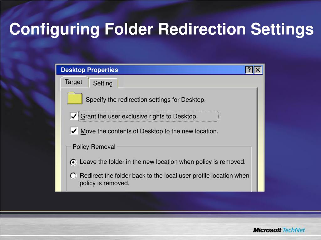 ? Desktop Properties Target Target Setting Specify the redirection settings for Desktop. Grant the user exclusive rights to Desktop. Move the contents of Desktop to the new location. Policy Removal Leave the folder in the new location when policy is removed. Redirect the folder back to the local user profile location when policy is removed. Setting Configuring Folder Redirection Settings