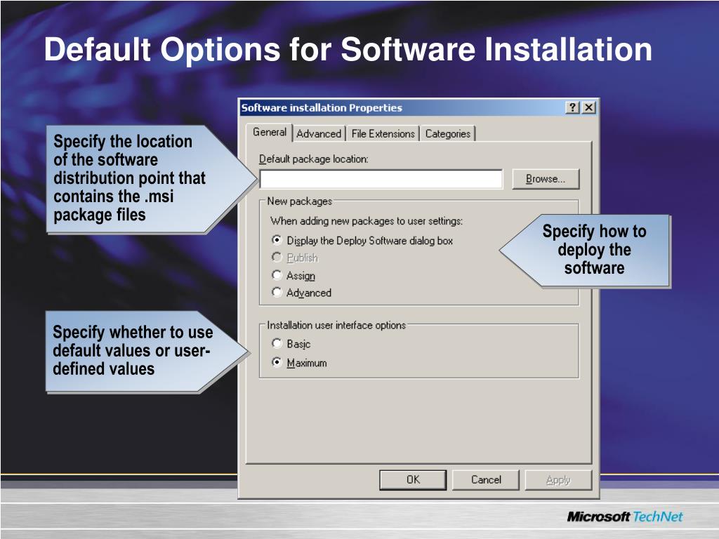 Default Options for Software Installation Specify the location of the software distribution point that contains the .msi package files Specify how to deploy the software Specify whether to use default values or user-defined values
