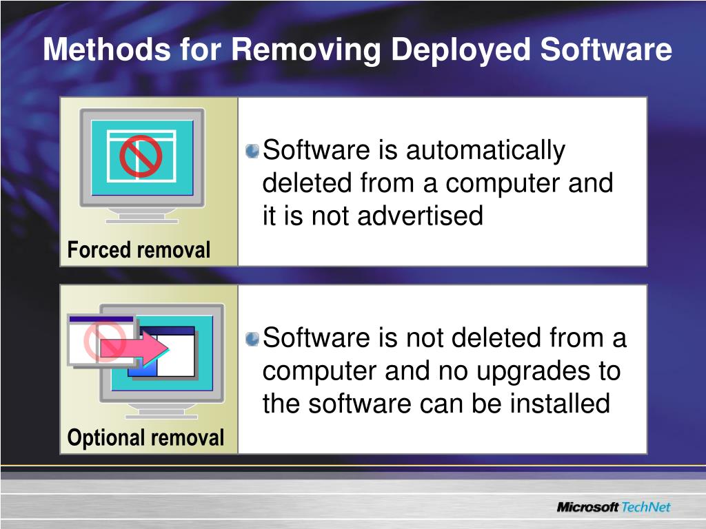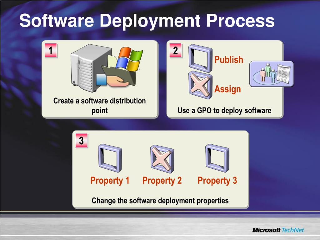 Create a software distribution point Use a GPO to deploy software 1 2 Publish Assign Change the software deployment properties 3 Property 1 Property 2 Property 3 Software Deployment Process