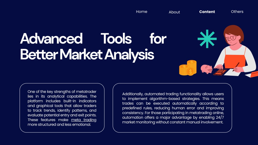 Home Others Content About Advanced Better Market Analysis Tools for One of the key strengths of metatrader lies in its analytical capabilities. The platform includes built-in indicators and graphical tools that allow traders to track trends, identify patterns, and evaluate potential entry and exit points. These features make meta trading more structured and less emotional. Additionally, automated trading functionality allows users to implement algorithm-based strategies. This means trades can be executed automatically according to predefined rules, reducing human error and improving consistency. For those participating in metatrading online, automation offers a major advantage by enabling 24/7 market monitoring without constant manual involvement.