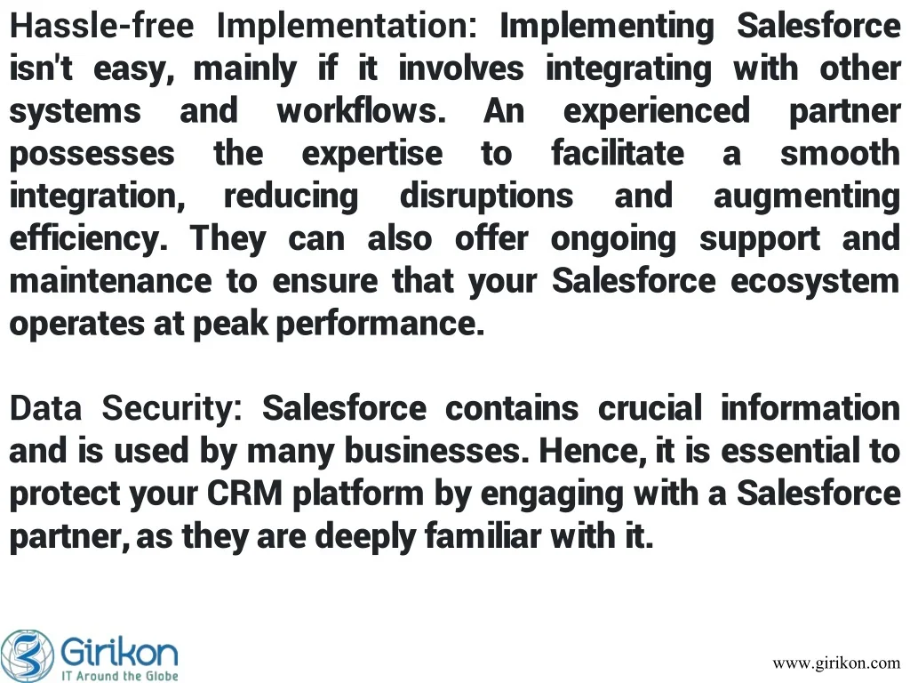 Hassle-free Implementation: Implementing Salesforce isn't easy, mainly if it involves integrating with other systems and workflows. An experienced partner possesses the expertise to facilitate a smooth integration, reducing disruptions and augmenting efficiency. They can also offer ongoing support and maintenance to ensure that your Salesforce ecosystem operates at peak performance. Data Security: Salesforce contains crucial information and is used by many businesses. Hence, it is essential to protect your CRM platform by engaging with a Salesforce partner, as they are deeply familiar with it. www.girikon.com