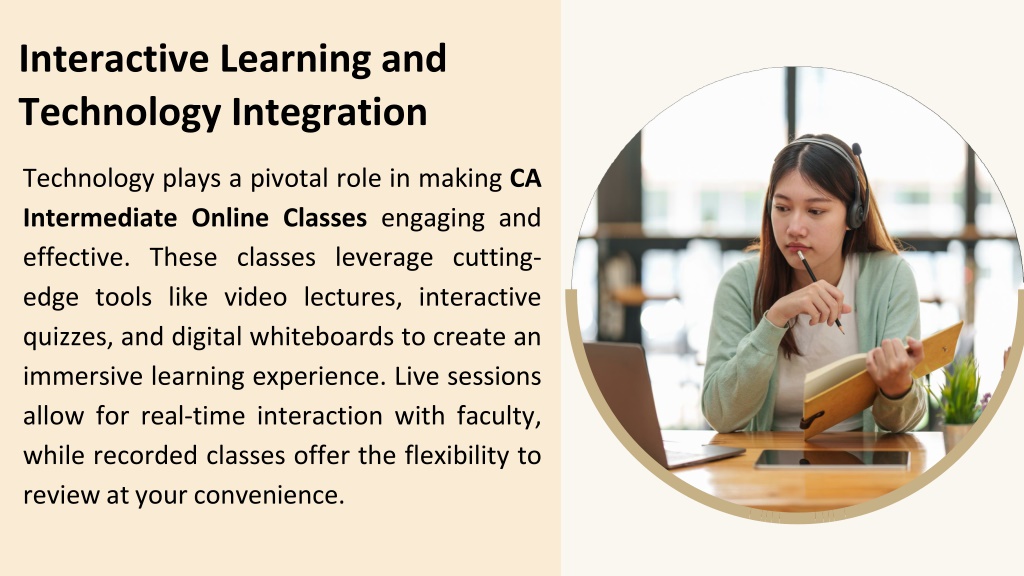 5. InteractiveLearningand TechnologyIntegration TechnologyplaysapivotalroleinmakingCA IntermediateOnlineClassesengagingand effective.Theseclassesleveragecutting- edgetoolslikevideolectures,interactive quizzes,anddigitalwhiteboardstocreatean immersivelearningexperience.Livesessions allowforreal-timeinteractionwithfaculty, whilerecordedclassesoffertheflexibilityto reviewatyourconvenience.