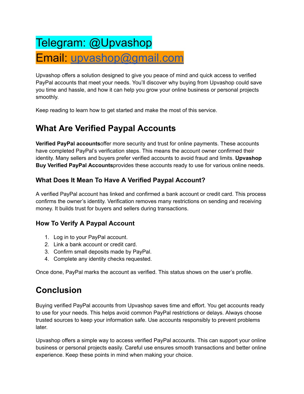 Verified status shows trustworthiness. Buyers trust sellers with verified accounts more. Sellers prefer buyers who are verified. This helps close deals faster and reduces disputes. Access To Full Paypal Features Verification unlocks all PayPal functions. Users can send, receive, withdraw, and link multiple accounts easily. Some features work only for verified users. How To Buy Verified Paypal Accounts On Upvashop Buying verified PayPal accounts on Upvashop is a straightforward process designed for ease and security. Upvashop offers a wide range of verified accounts that suit different needs. Knowing how to navigate their platform ensures a smooth purchase experience. This section explains the steps to buy verified PayPal accounts on Upvashop, focusing on account selection, payment methods, and delivery details. Follow this guide to make an informed decision and complete your purchase quickly. we are online 24/7 hours WhatsApp: +1 (762) 406-0172 Telegram: @Upvashop Email: upvashop@gmail.com Reading PayPal’s user agreement and updates regularly keeps you informed. Following policies protects your funds and helps avoid disruptions. Frequently Asked Questions What Are Verified Paypal Accounts From Upvashop? Verified PayPal accounts from Upvashop are pre-checked, secure accounts ready for immediate use. They ensure smoother transactions and higher trust. Why Should I Buy Verified Paypal Accounts? Buying verified accounts saves time on verification steps. It enables quick access to PayPal services without delays or restrictions. How Does Upvashop Ensure Account Security?