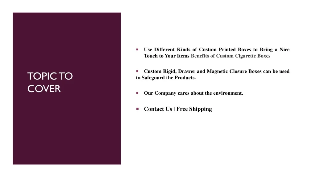 Use Different Kinds of Custom Printed Boxes to Bring a Nice Touch to Your Items Benefits of Custom Cigarette Boxes Custom Rigid, Drawer and Magnetic Closure Boxes can be used to Safeguard the Products. TOPIC TO COVER Our Company cares about the environment. Contact Us | Free Shipping
