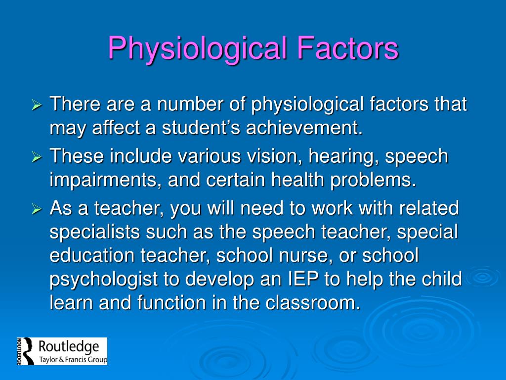 Physiological Factors • There are a number of physiological factors that may affect a student’s achievement. • These include various vision, hearing, speech impairments, and certain health problems. • As a teacher, you will need to work with related specialists such as the speech teacher, special education teacher, school nurse, or school psychologist to develop an IEP to help the child learn and function in the classroom.