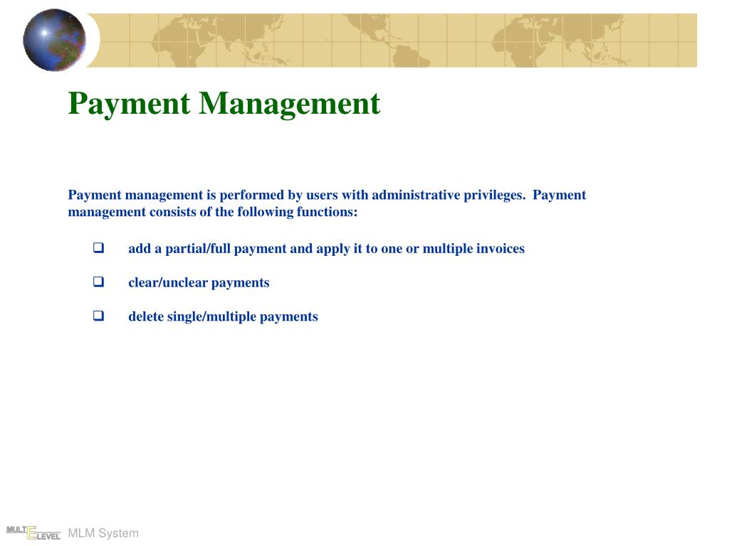 Payment Management Payment management is performed by users with administrative privileges. Payment management consists of the following functions: • add a partial/full payment and apply it to one or multiple invoices • clear/unclear payments • delete single/multiple payments