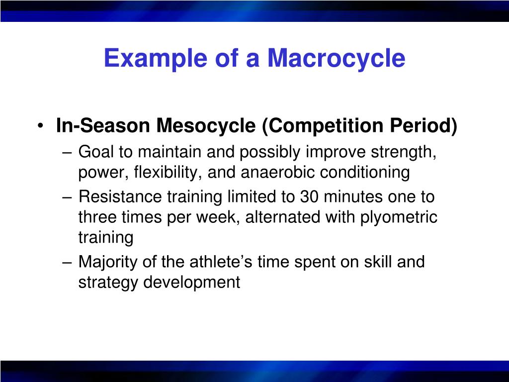 Example of a Macrocycle • In-Season Mesocycle (Competition Period) • Goal to maintain and possibly improve strength, power, flexibility, and anaerobic conditioning • Resistance training limited to 30 minutes one to three times per week, alternated with plyometric training • Majority of the athlete’s time spent on skill and strategy development