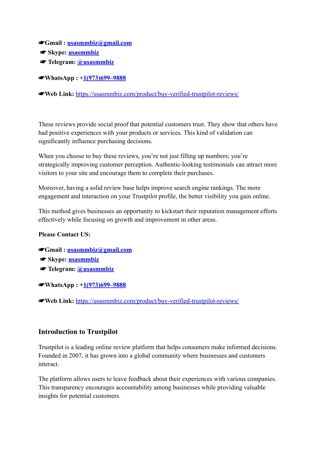 ☛WhatsApp : +1(973)699–9888 ☛Web Link: https://usasmmbiz.com/product/buy-verified-trustpilot-reviews/ Understanding Verified Trustpilot Reviews Verified Trustpilot reviews are authentic feedback from customers who have had real experiences with a business. These reviews undergo a rigorous verification process, ensuring that the comments reflect genuine interactions. This system helps to eliminate fake or biased submissions. Customers can trust that what they read is credible and represents true opinions. For businesses, having verified reviews is crucial. They enhance transparency and build trust with potential customers. When people see these validated endorsements, they feel more confident in their purchasing decisions. Moreover, verified reviews contribute to better search engine rankings. Google favors companies that showcase honest customer feedback. This visibility can drive traffic to your site and increase overall sales potential. Understanding this distinction empowers businesses to leverage positive feedback effectively while mitigating negative impressions from unverified sources. Please Contact US: ☛Gmail : usasmmbiz@gmail.com ☛ Skype: usasmmbiz ☛ Telegram: @usasmmbiz ☛WhatsApp : +1(973)699–9888 ☛Web Link: https://usasmmbiz.com/product/buy-verified-trustpilot-reviews/ Benefits of Buying Verified Trustpilot Reviews Buying verified Trustpilot reviews can significantly enhance a business’s online presence. Authentic feedback from real customers fosters trust and credibility, essential elements for attracting new clients.