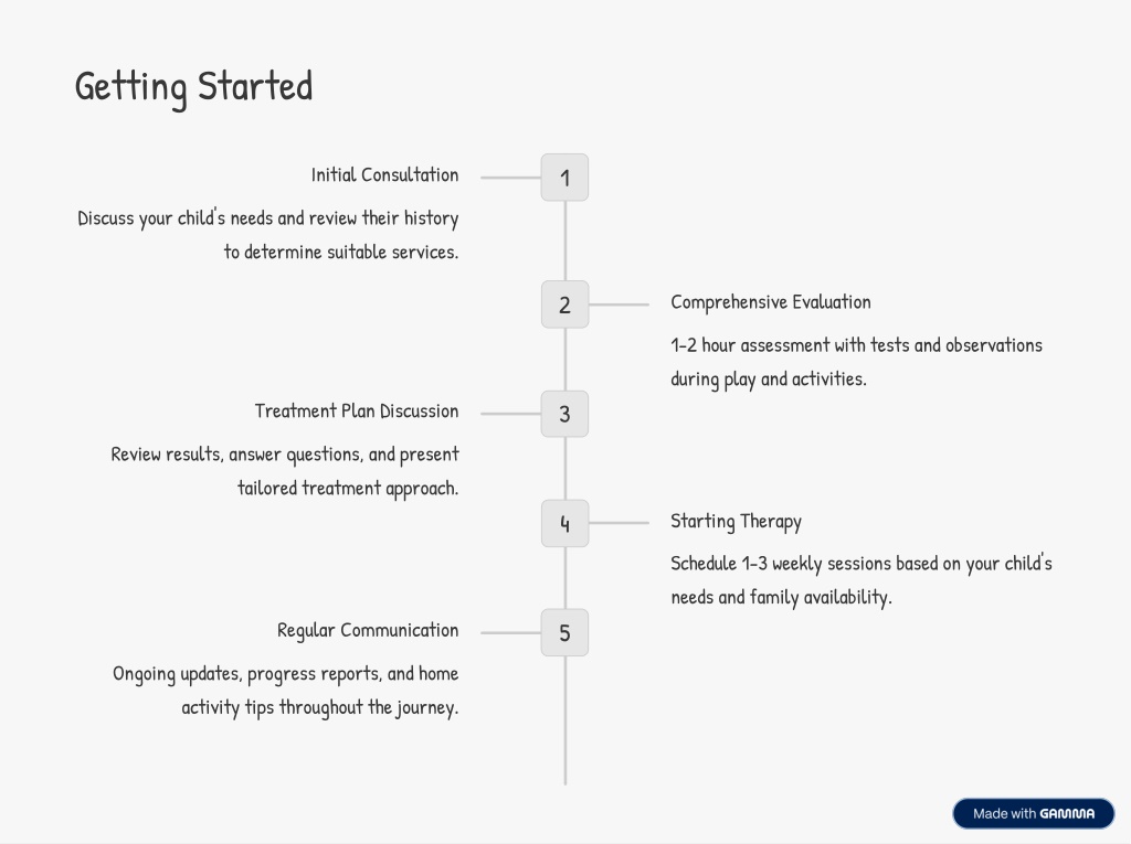 Getting Started Initial Consultation 1 Discuss your child's needs and review their history to determine suitable services. Comprehensive Evaluation 2 1-2 hour assessment with tests and observations during play and activities. Treatment Plan Discussion 3 Review results, answer questions, and present tailored treatment approach. Starting Therapy 4 Schedule 1-3 weekly sessions based on your child's needs and family availability. Regular Communication 5 Ongoing updates, progress reports, and home activity tips throughout the journey.