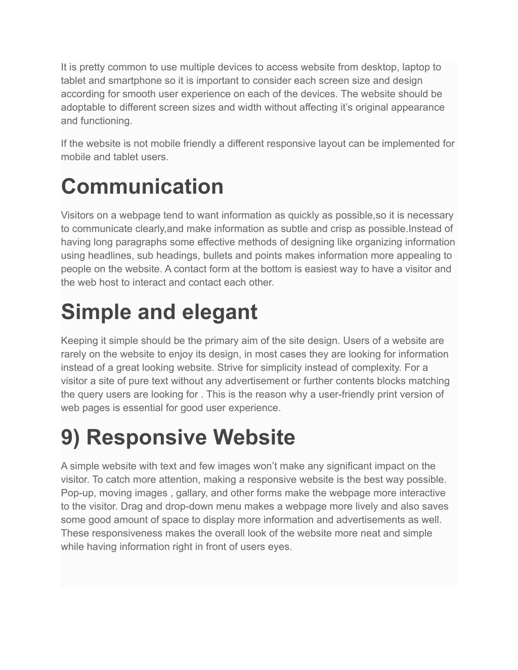 It is pretty common to use multiple devices to access website from desktop, laptop to tablet and smartphone so it is important to consider each screen size and design according for smooth user experience on each of the devices. The website should be adoptable to different screen sizes and width without affecting it’s original appearance and functioning. If the website is not mobile friendly a different responsive layout can be implemented for mobile and tablet users. Communication Visitors on a webpage tend to want information as quickly as possible,so it is necessary to communicate clearly,and make information as subtle and crisp as possible.Instead of having long paragraphs some effective methods of designing like organizing information using headlines, sub headings, bullets and points makes information more appealing to people on the website. A contact form at the bottom is easiest way to have a visitor and the web host to interact and contact each other. Simple and elegant Keeping it simple should be the primary aim of the site design. Users of a website are rarely on the website to enjoy its design, in most cases they are looking for information instead of a great looking website. Strive for simplicity instead of complexity. For a visitor a site of pure text without any advertisement or further contents blocks matching the query users are looking for . This is the reason why a user-friendly print version of web pages is essential for good user experience. 9) Responsive Website A simple website with text and few images won’t make any significant impact on the visitor. To catch more attention, making a responsive website is the best way possible. Pop-up, moving images , gallary, and other forms make the webpage more interactive to the visitor. Drag and drop-down menu makes a webpage more lively and also saves some good amount of space to display more information and advertisements as well. These responsiveness makes the overall look of the website more neat and simple while having information right in front of users eyes.