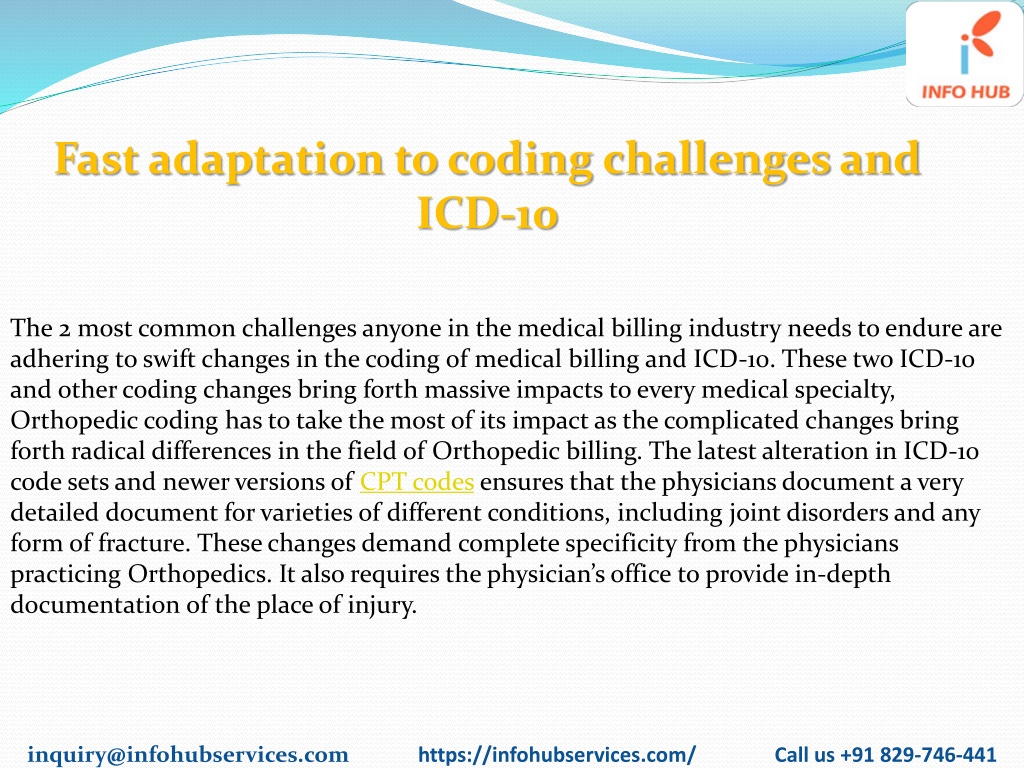 The 2 most common challenges anyone in the medical billing industry needs to endure are adhering to swift changes in the coding of medical billing and ICD-10. These two ICD-10 and other coding changes bring forth massive impacts to every medical specialty, Orthopedic coding has to take the most of its impact as the complicated changes bring forth radical differences in the field of Orthopedic billing. The latest alteration in ICD-10 code sets and newer versions of CPT codes ensures that the physicians document a very detailed document for varieties of different conditions, including joint disorders and any form of fracture. These changes demand complete specificity from the physicians practicing Orthopedics. It also requires the physician’s office to provide in-depth documentation of the place of injury. Fast adaptation to coding challenges and ICD-10 inquiry@infohubservices.comhttps://infohubservices.com/ Call us +91 829-746-441