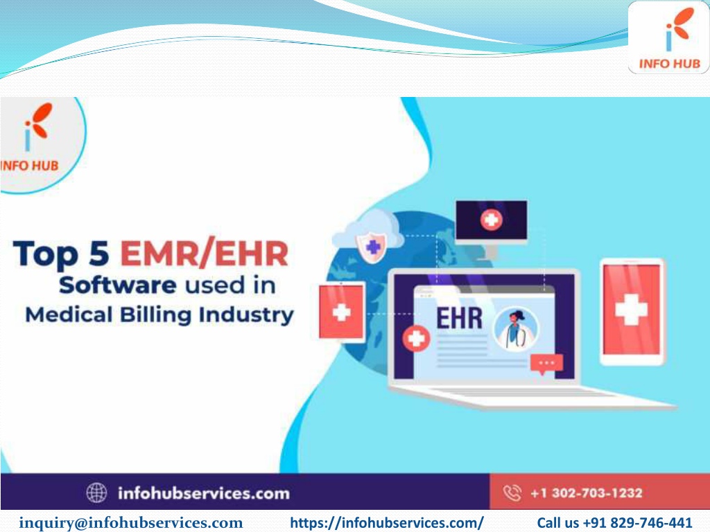 Top 5 EMR/EHR Software used in Medical Billing Industry The Electronic Medical Record (EMR) and the Electronic Health Record (EHR) are two medical software that are designed to deal with the various back-office tasks of a medical facility. The software is used for tracking the patient appointments and billing details, taking down care notes and records of the patient health, and other information at one place. This software is considered as core requirement for those hospitals and clinics that have multiple branches across the country. Usually, this software provides efficient documentation of medical history and billing along with data extraction and workflow standardization to meet the compliance and regulatory requirements. inquiry@infohubservices.com https://infohubservices.com/ Call us +91 829-746-441
