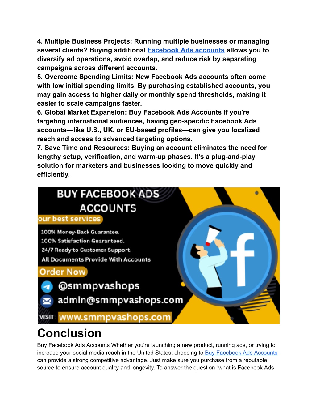 4. Multiple Business Projects: Running multiple businesses or managing several clients? Buying additional Facebook Ads accounts allows you to diversify ad operations, avoid overlap, and reduce risk by separating campaigns across different accounts. 5. Overcome Spending Limits: New Facebook Ads accounts often come with low initial spending limits. By purchasing established accounts, you may gain access to higher daily or monthly spend thresholds, making it easier to scale campaigns faster. 6. Global Market Expansion: Buy Facebook Ads Accounts If you're targeting international audiences, having geo-specific Facebook Ads accounts—like U.S., UK, or EU-based profiles—can give you localized reach and access to advanced targeting options. 7. Save Time and Resources: Buying an account eliminates the need for lengthy setup, verification, and warm-up phases. It’s a plug-and-play solution for marketers and businesses looking to move quickly and efficiently. Conclusion Buy Facebook Ads Accounts Whether you're launching a new product, running ads, or trying to increase your social media reach in the United States, choosing to Buy Facebook Ads Accounts can provide a strong competitive advantage. Just make sure you purchase from a reputable source to ensure account quality and longevity. To answer the question “what is Facebook Ads