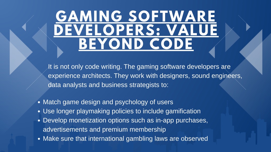 GAMING SOFTWARE DEVELOPERS: VALUE BEYOND CODE It is not only code writing. The gaming software developers are experience architects. They work with designers, sound engineers, data analysts and business strategists to: Match game design and psychology of users Use longer playmaking policies to include gamification Develop monetization options such as in-app purchases, advertisements and premium membership Make sure that international gambling laws are observed