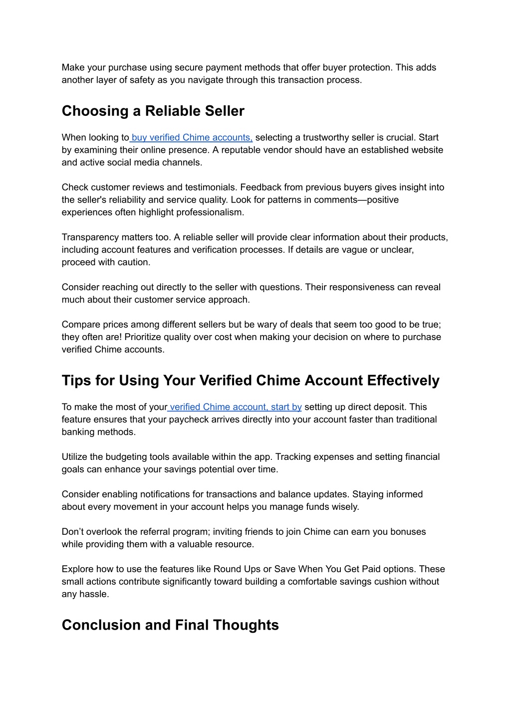Make your purchase using secure payment methods that offer buyer protection. This adds another layer of safety as you navigate through this transaction process. Choosing a Reliable Seller When looking to buy verified Chime accounts, selecting a trustworthy seller is crucial. Start by examining their online presence. A reputable vendor should have an established website and active social media channels. Check customer reviews and testimonials. Feedback from previous buyers gives insight into the seller's reliability and service quality. Look for patterns in comments—positive experiences often highlight professionalism. Transparency matters too. A reliable seller will provide clear information about their products, including account features and verification processes. If details are vague or unclear, proceed with caution. Consider reaching out directly to the seller with questions. Their responsiveness can reveal much about their customer service approach. Compare prices among different sellers but be wary of deals that seem too good to be true; they often are! Prioritize quality over cost when making your decision on where to purchase verified Chime accounts. Tips for Using Your Verified Chime Account Effectively To make the most of your verified Chime account, start by setting up direct deposit. This feature ensures that your paycheck arrives directly into your account faster than traditional banking methods. Utilize the budgeting tools available within the app. Tracking expenses and setting financial goals can enhance your savings potential over time. Consider enabling notifications for transactions and balance updates. Staying informed about every movement in your account helps you manage funds wisely. Don’t overlook the referral program; inviting friends to join Chime can earn you bonuses while providing them with a valuable resource. Explore how to use the features like Round Ups or Save When You Get Paid options. These small actions contribute significantly toward building a comfortable savings cushion without any hassle. Conclusion and Final Thoughts