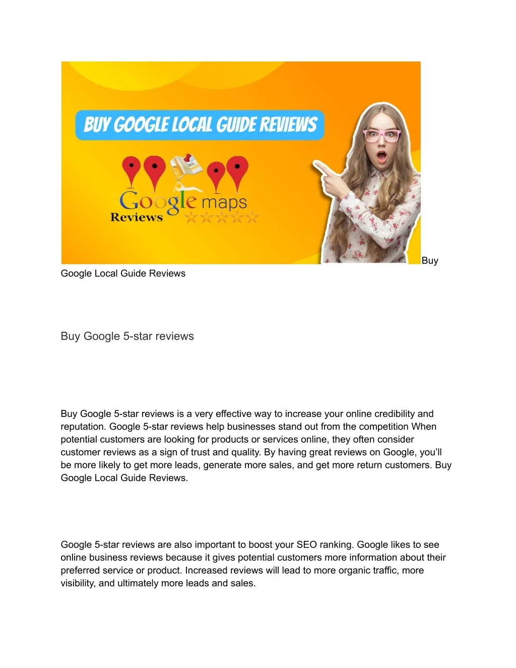 Buy Google Local Guide Reviews If you’re looking to improve your business’s online reputation, I would recommend focusing on providing excellent products or services and encouraging your satisfied customers to leave honest reviews. Building a positive reputation organically is a more sustainable and ethical approach in the long run. We offer 100% live reviews, permanent reviews, and reviews in good standing. As soon as you place your order, we get to work with the largest teams. So buy our service and enjoy it Buy Google Local Guide Reviews. https://reviewinsta.com/shop/buy-google-local-guide-reviews/ For more info, please contact us now. 24-hour response/contact Email: reviewinsta38@gmail.com Telegram: @Reviewinsta Skype: Reviewinsta WhatsApp: +1 (717) 896-0147 Buy Google Local Guide Reviews Have you ever wanted to increase your presence on Google? Buy Google Local Guide Reviews today and you’ll be well on your way to making the most of the world’s largest search engine Google Local Guide reviews are a useful way to quickly and easily build your presence on Google Buy Google Local Guide Reviews you increase the visibility of your business, provide direct links to your store to potential customers, and showcase the services or products you provide. With some favorable reviews, your business can increase foot traffic, convert potential customers into clients, and build a positive online reputation.