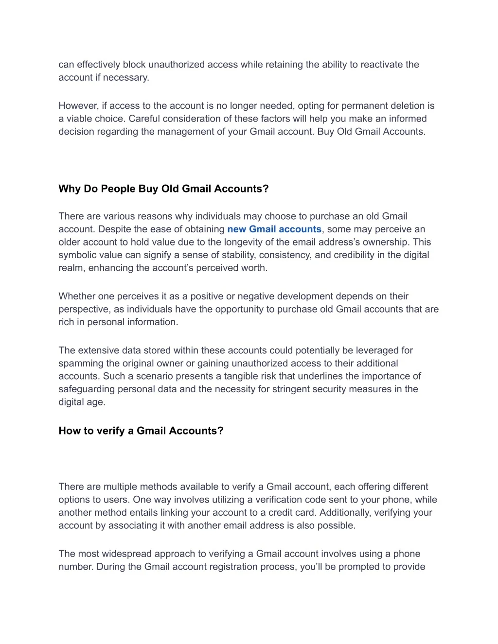 can effectively block unauthorized access while retaining the ability to reactivate the account if necessary. However, if access to the account is no longer needed, opting for permanent deletion is a viable choice. Careful consideration of these factors will help you make an informed decision regarding the management of your Gmail account. Buy Old Gmail Accounts. Why Do People Buy Old Gmail Accounts? There are various reasons why individuals may choose to purchase an old Gmail account. Despite the ease of obtaining new Gmail accounts, some may perceive an older account to hold value due to the longevity of the email address’s ownership. This symbolic value can signify a sense of stability, consistency, and credibility in the digital realm, enhancing the account’s perceived worth. Whether one perceives it as a positive or negative development depends on their perspective, as individuals have the opportunity to purchase old Gmail accounts that are rich in personal information. The extensive data stored within these accounts could potentially be leveraged for spamming the original owner or gaining unauthorized access to their additional accounts. Such a scenario presents a tangible risk that underlines the importance of safeguarding personal data and the necessity for stringent security measures in the digital age. How to verify a Gmail Accounts? There are multiple methods available to verify a Gmail account, each offering different options to users. One way involves utilizing a verification code sent to your phone, while another method entails linking your account to a credit card. Additionally, verifying your account by associating it with another email address is also possible. The most widespread approach to verifying a Gmail account involves using a phone number. During the Gmail account registration process, you’ll be prompted to provide
