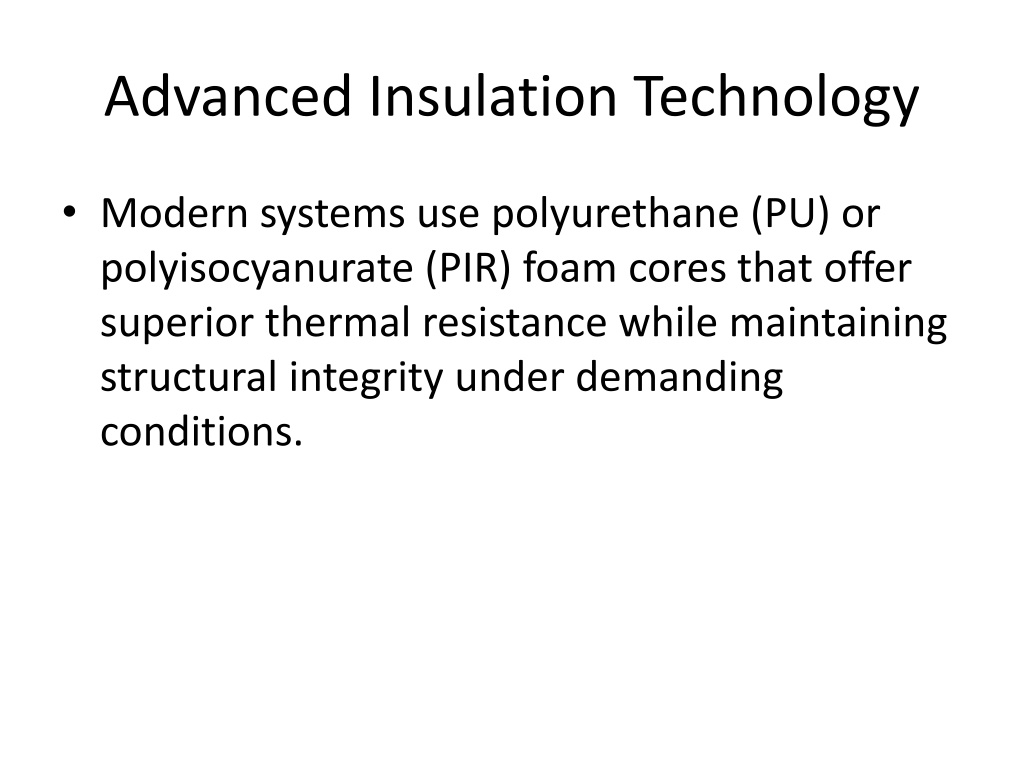 Advanced Insulation Technology • Modern systems use polyurethane (PU) or polyisocyanurate (PIR) foam cores that offer superior thermal resistance while maintaining structural integrity under demanding conditions.