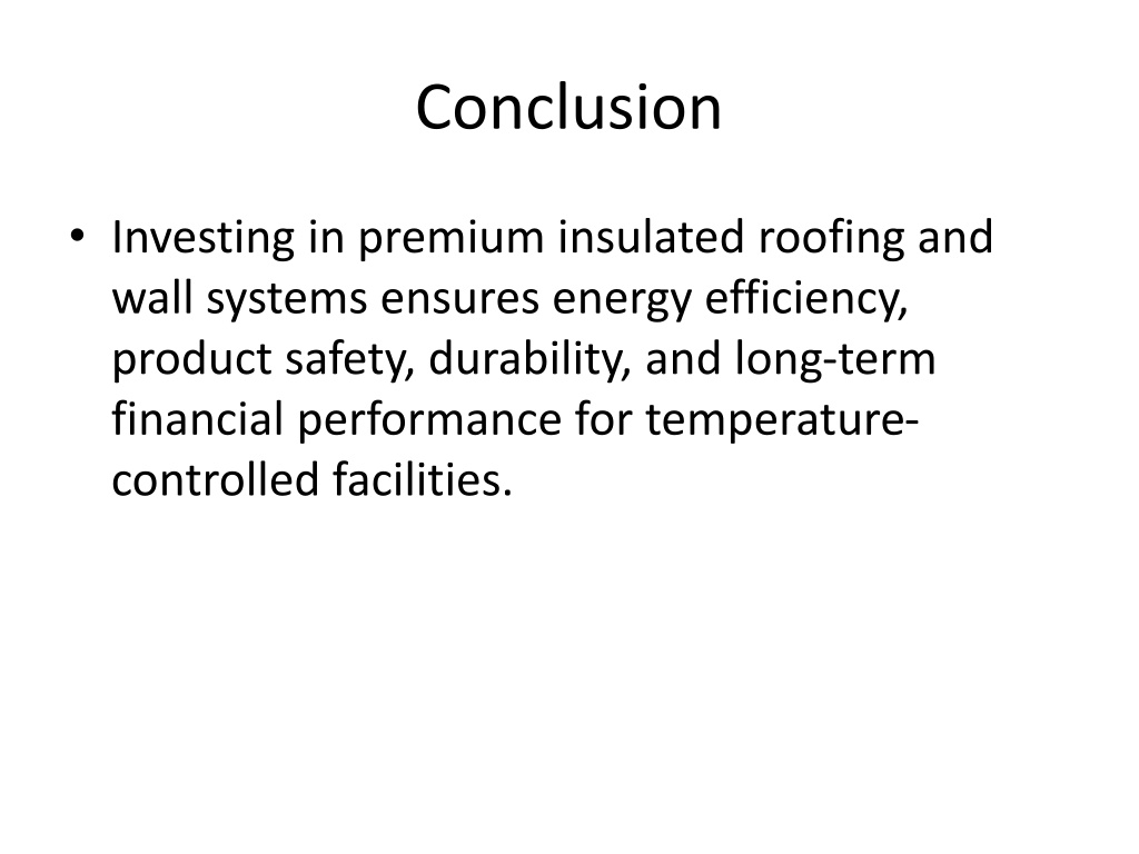 Conclusion • Investing in premium insulated roofing and wall systems ensures energy efficiency, product safety, durability, and long-term financial performance for temperature-controlled facilities.
