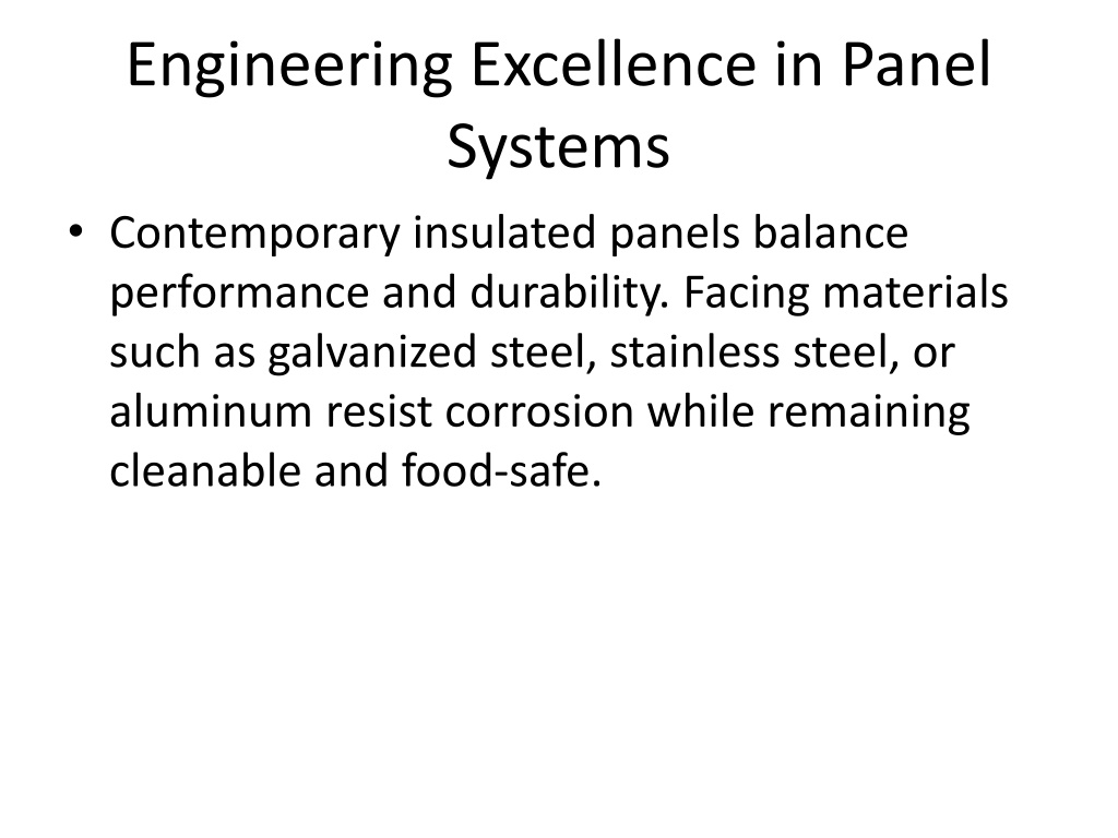 Engineering Excellence in Panel Systems • Contemporary insulated panels balance performance and durability. Facing materials such as galvanized steel, stainless steel, or aluminum resist corrosion while remaining cleanable and food-safe.