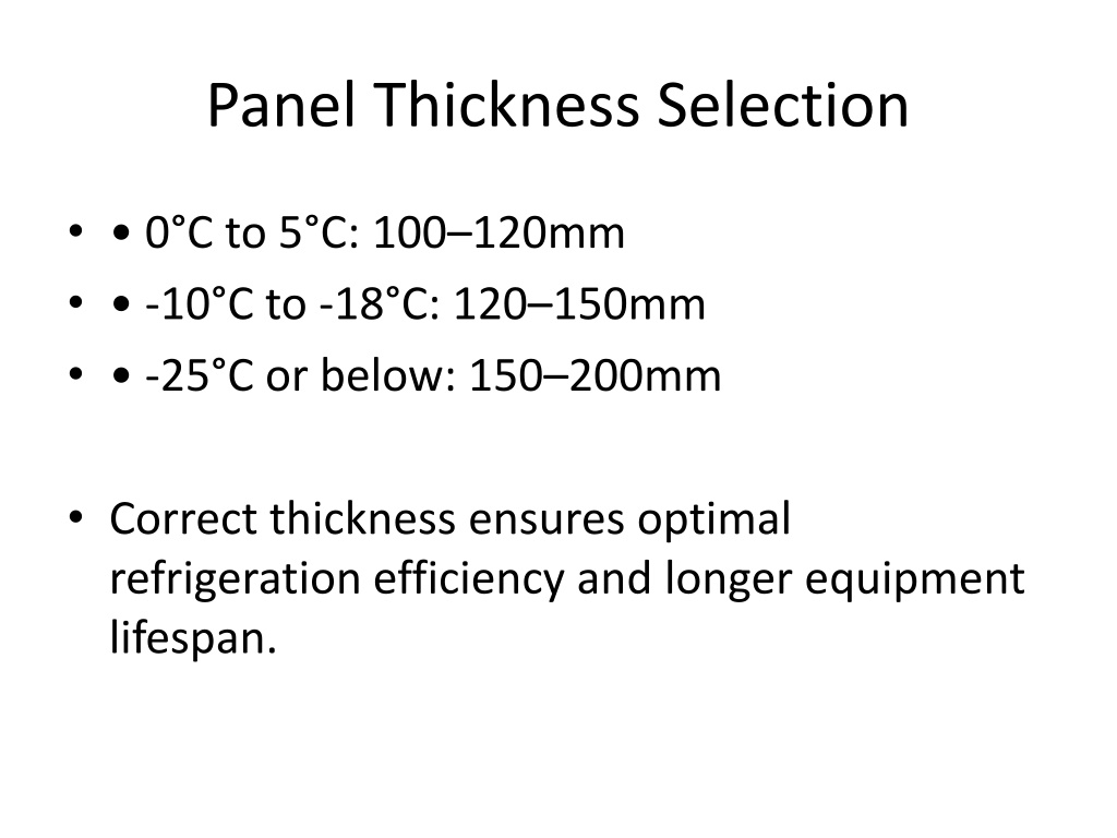 Panel Thickness Selection • • 0°C to 5°C: 100–120mm • • -10°C to -18°C: 120–150mm • • -25°C or below: 150–200mm • Correct thickness ensures optimal refrigeration efficiency and longer equipment lifespan.