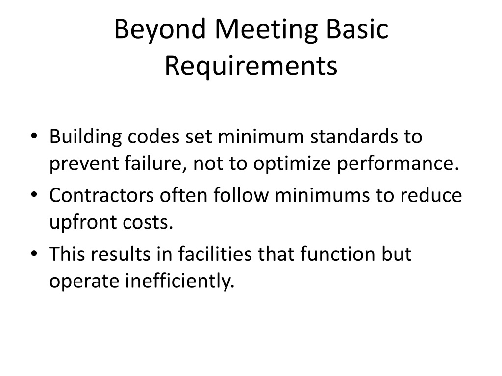 Beyond Meeting Basic Requirements • Building codes set minimum standards to prevent failure, not to optimize performance. • Contractors often follow minimums to reduce upfront costs. • This results in facilities that function but operate inefficiently.